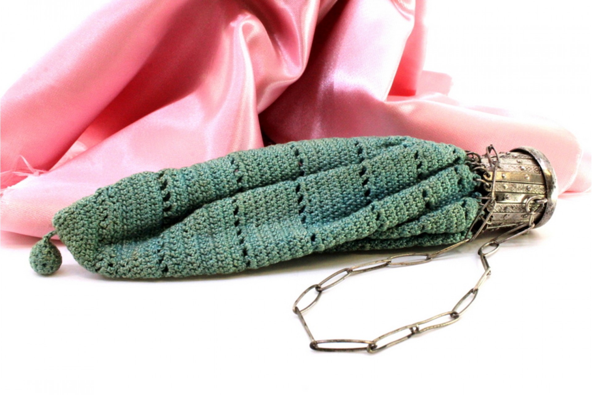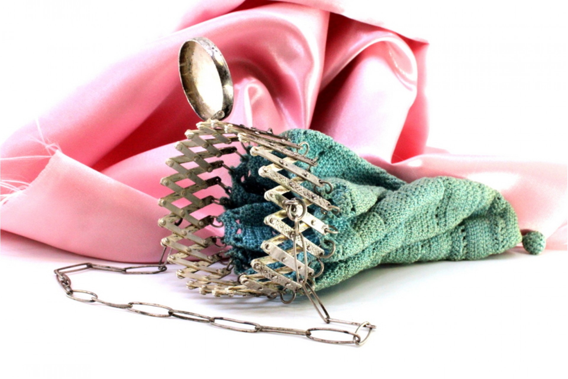 • Descrição: Bolsa de mão com estrutura em prata, tecido de renda, e corrente em malha cadeado.