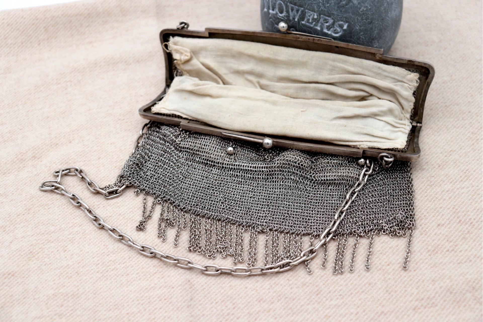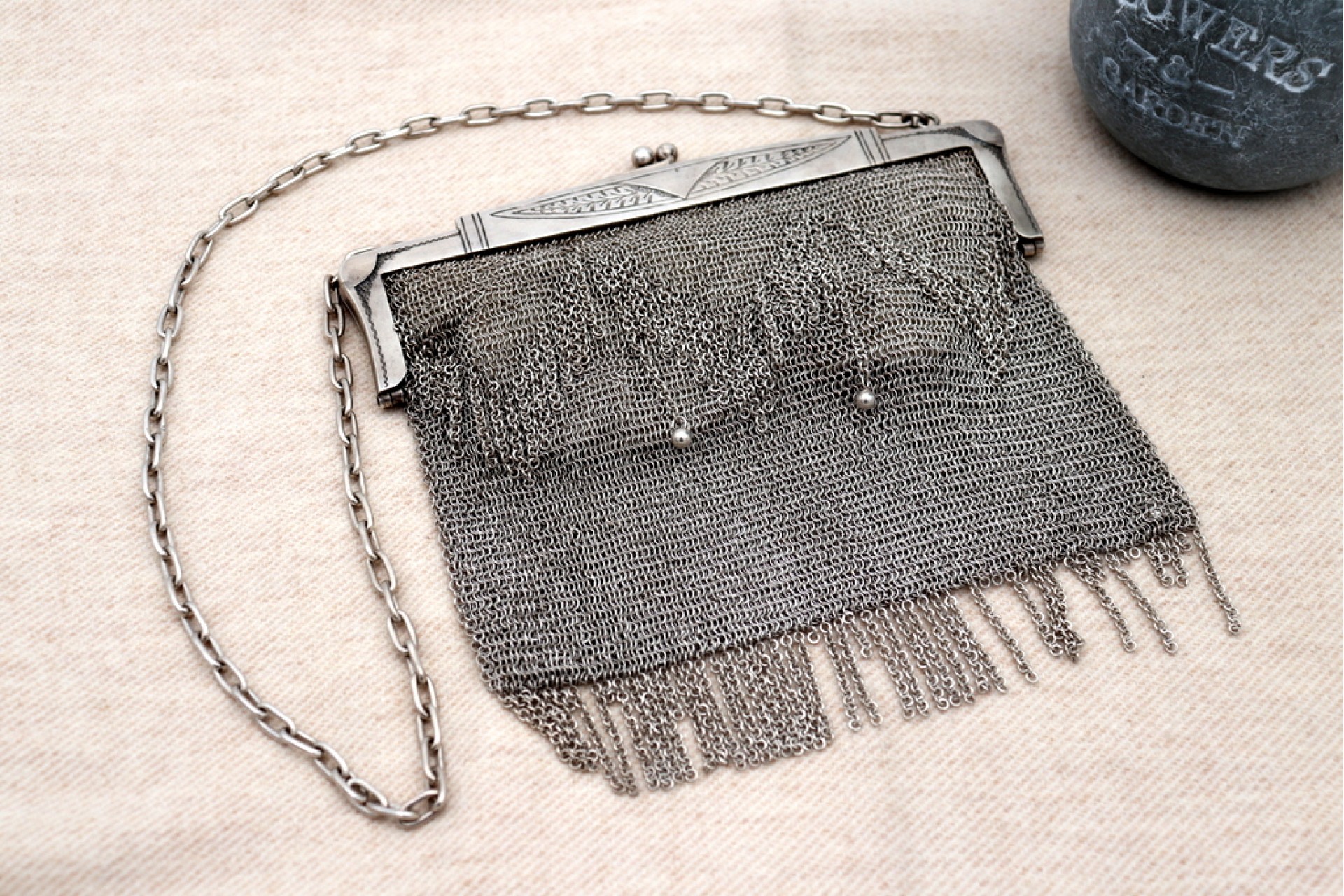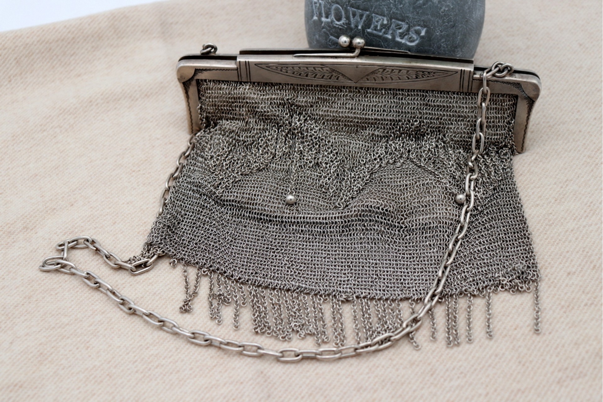 • Descrição: Bolsa em malha de prata com dois pingentes em forma de bola e cadilhes articulados, interior forrado a tecido,  arco com relevos e corrente em malha cadeado.