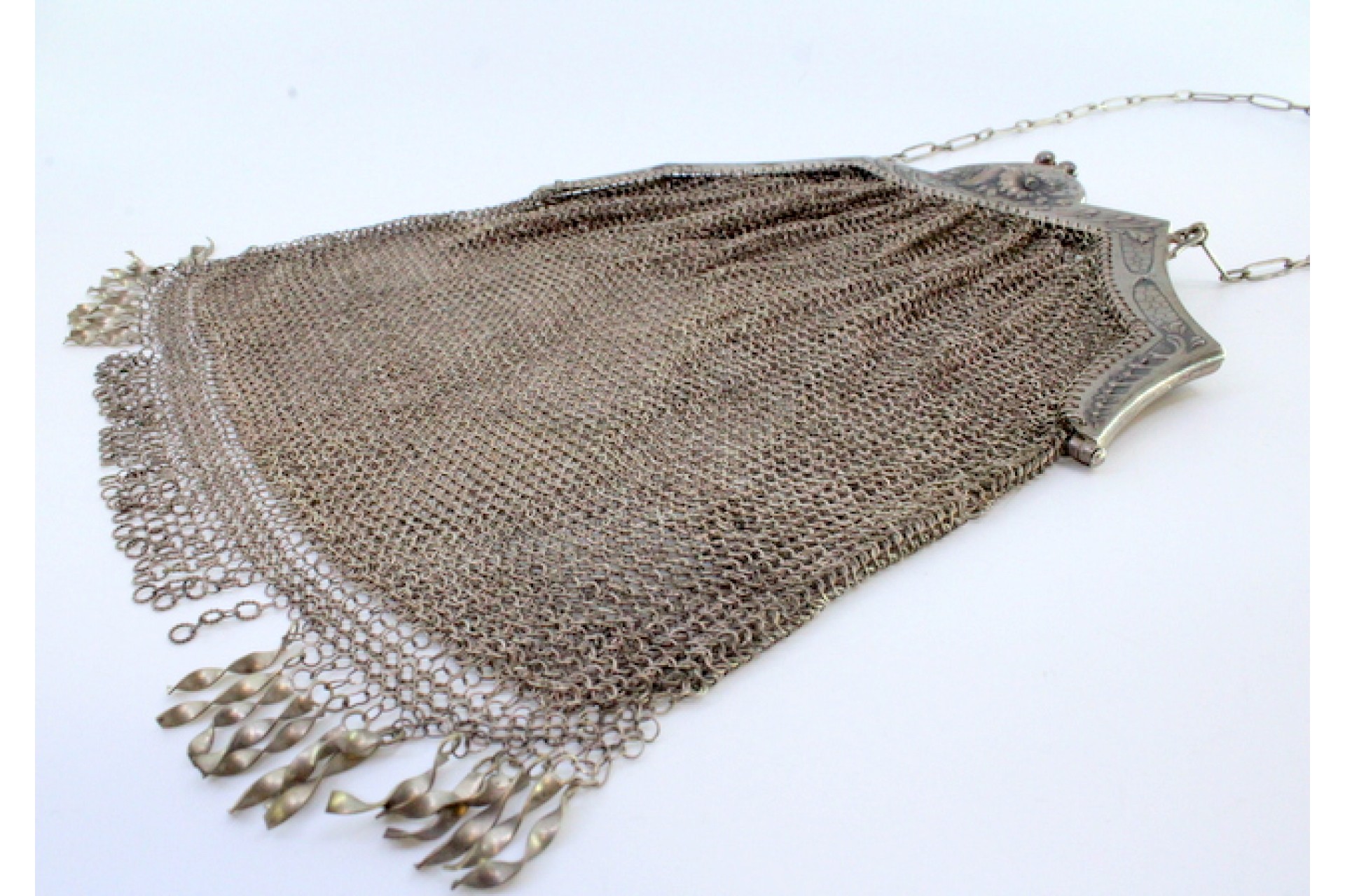 • Descrição: Bolsa de mão em prata com motivos florais relevados no arco recortado e corrente em malha cadeado.
