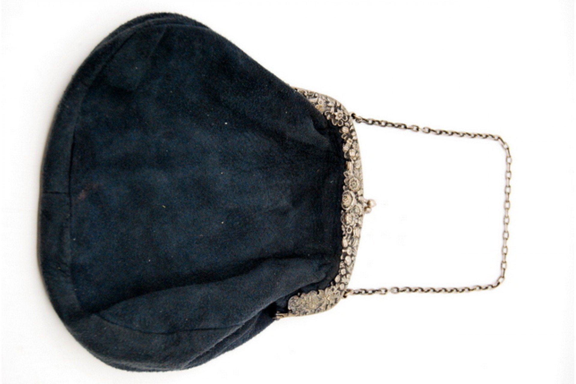 • Descrição: Bolsa de mão com arco em prata relevado com motivos florais suportando a bolsa em pele de camurça e interior forrado.