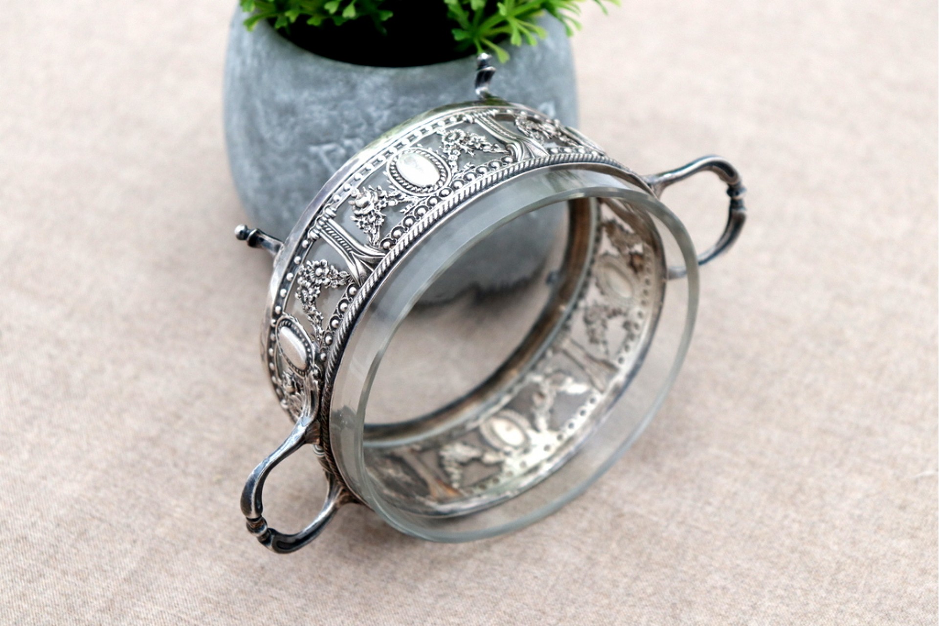 • Descrição: Bomboneira de vidro com estrutura em prata perlada, grinaldas, frisos perlados, asas com terminus em folhas de acanto e assente em quatro pés relevados.