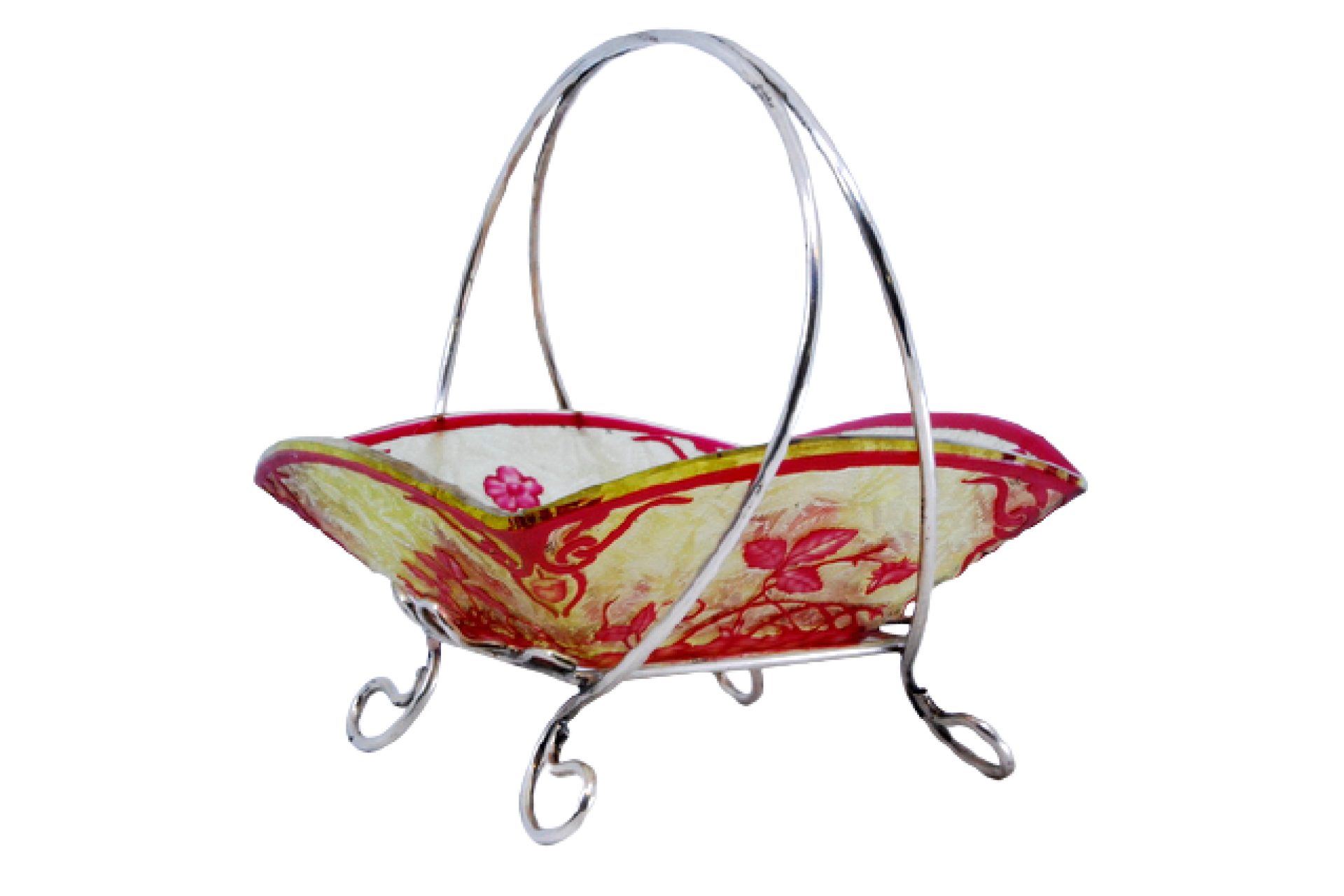 • Descrição: Bomboneira em vidro assente em estrutura em prata com quatro pés e enrolamentos.