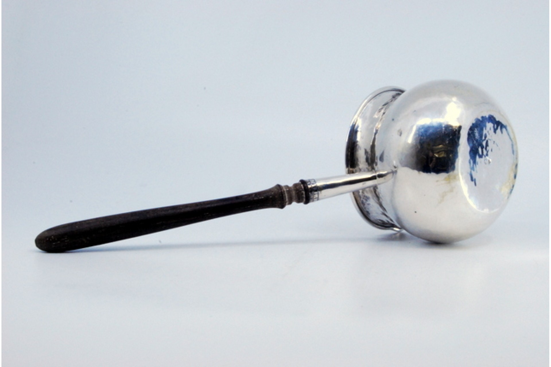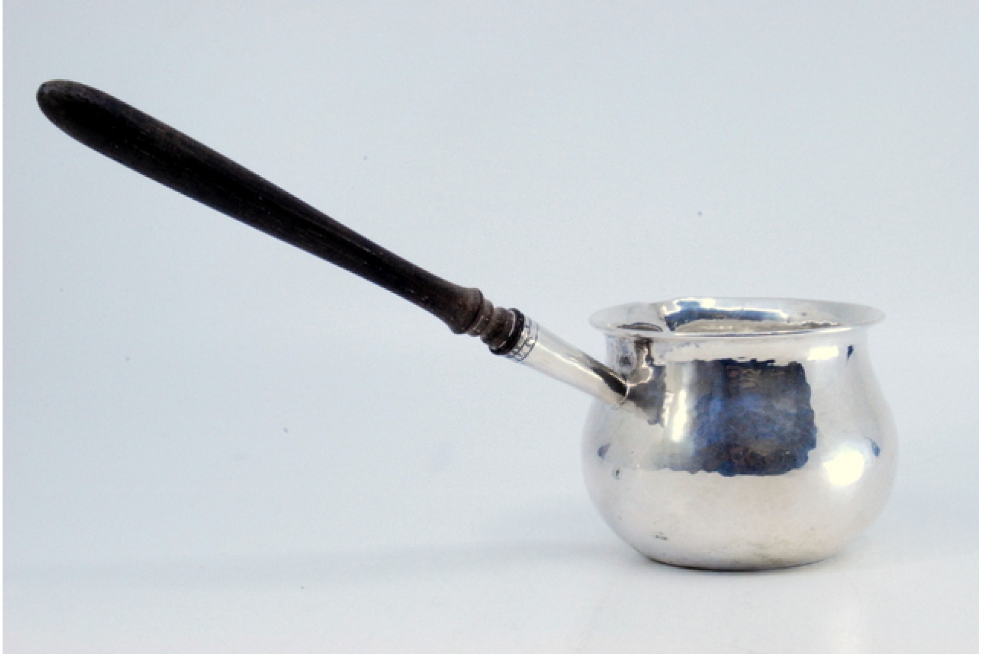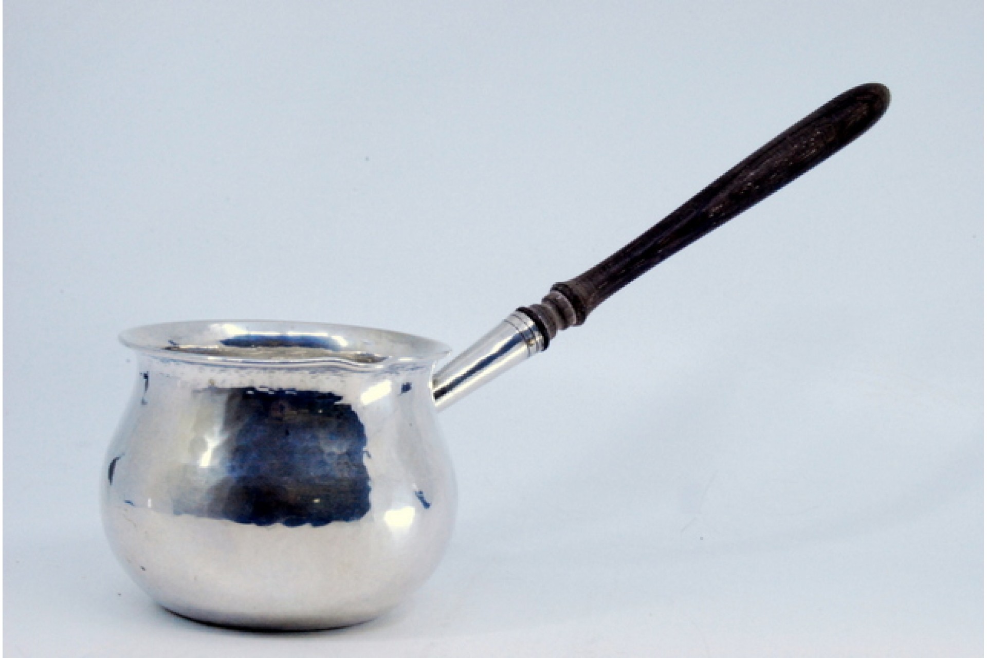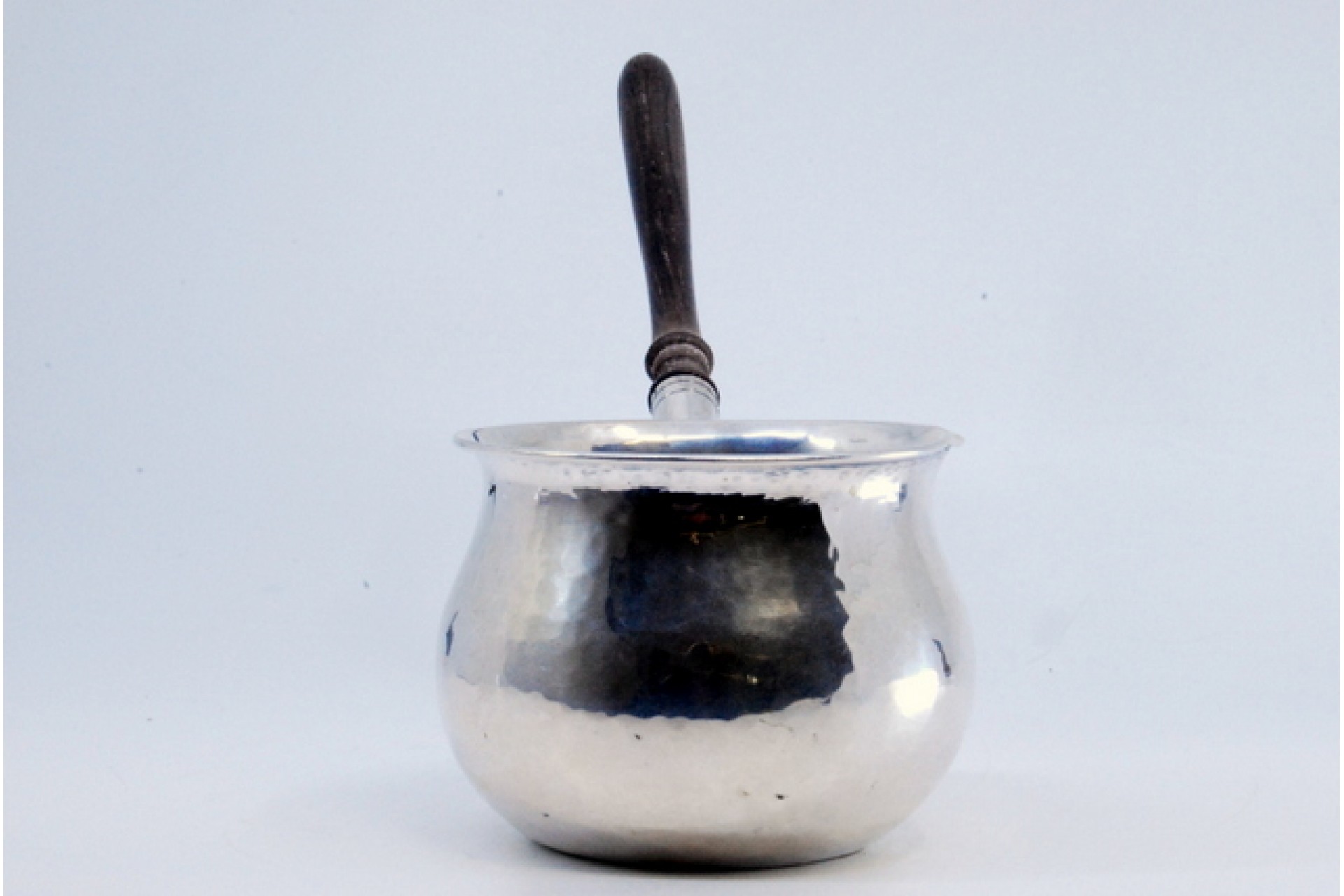 Caçarola em prata martelada com cabo em madeira.
