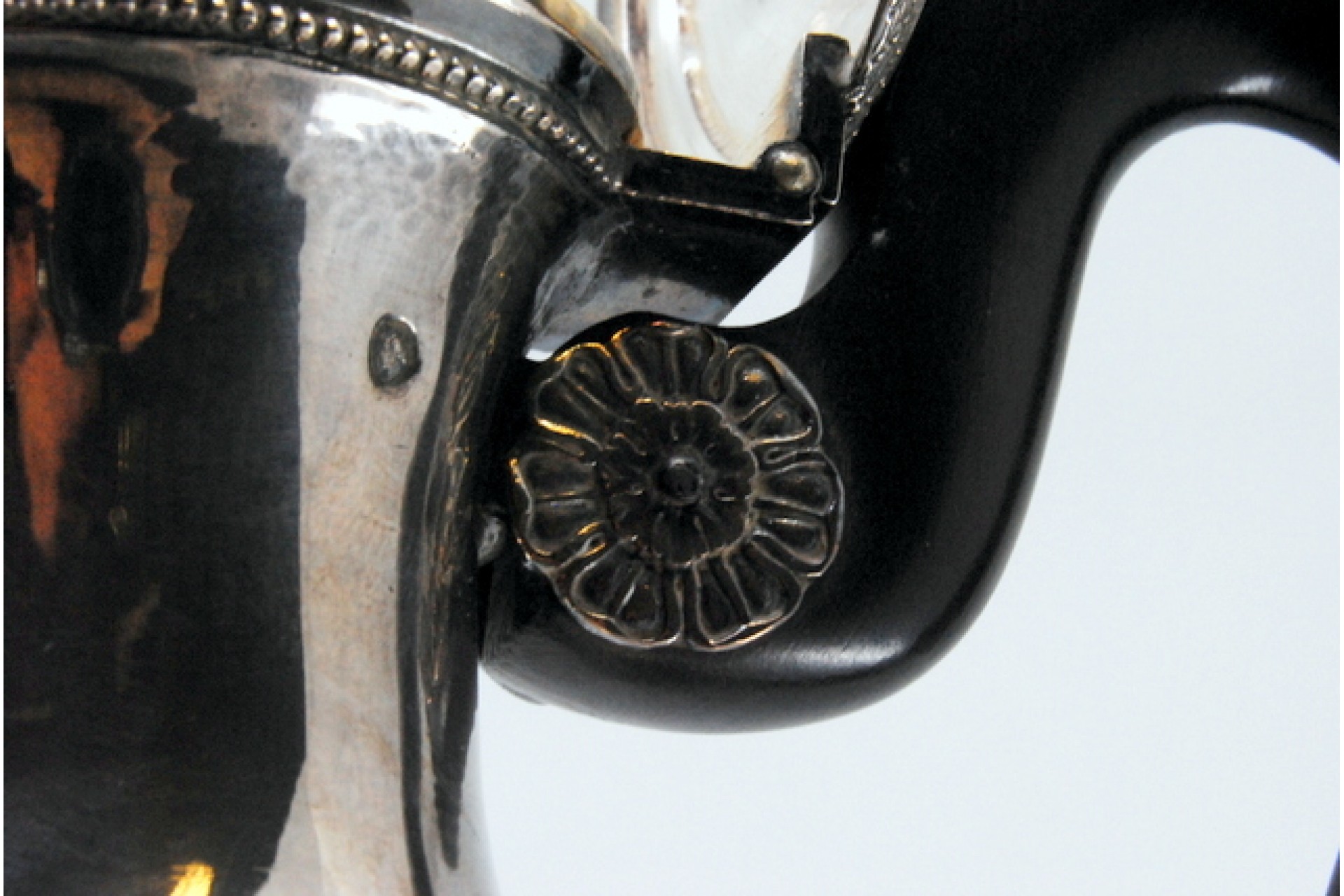 • Descrição: Cafeteira em prata com o corpo e tampa frisados e cabo em madeira de castanho, bico com figura mitológica e assente sobre três pés alteados.