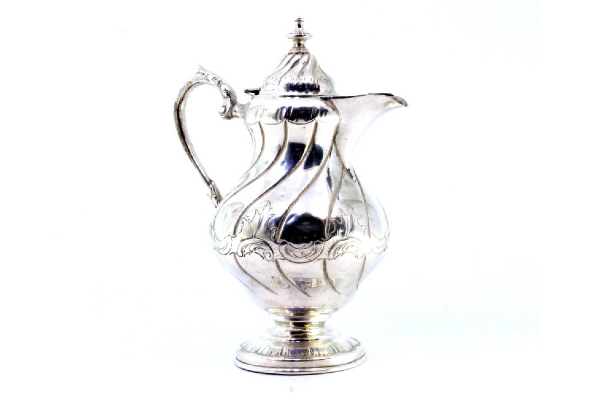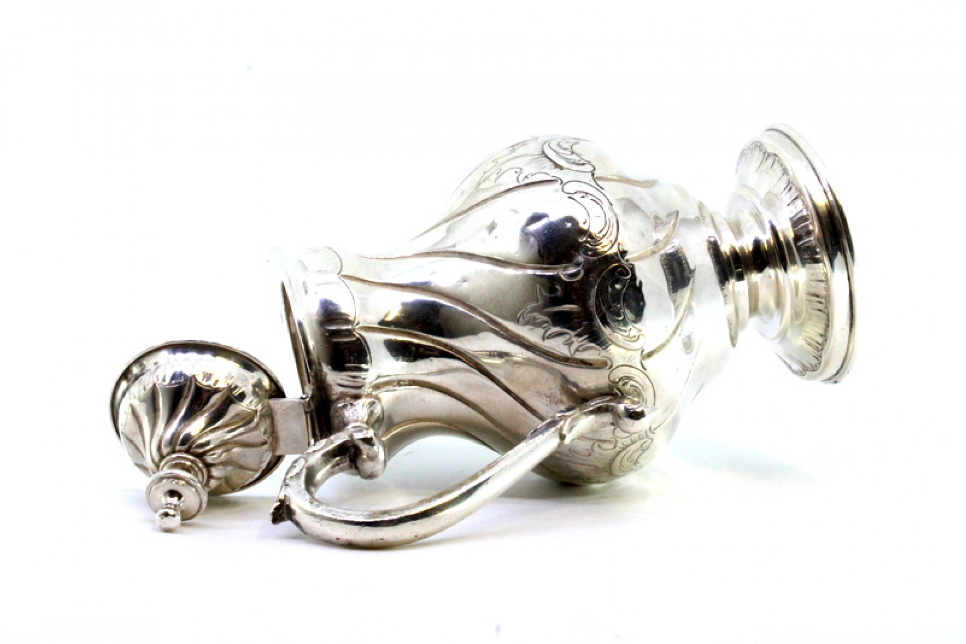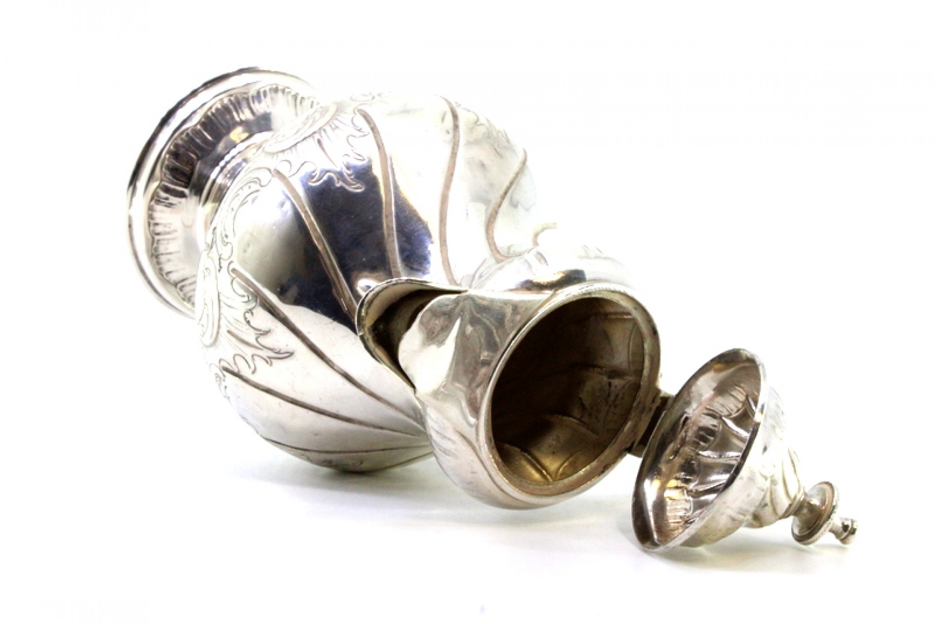 • Descrição: Cafeteira em prata com frisos gomados gravados, pomo na tampa e assente em base circular.