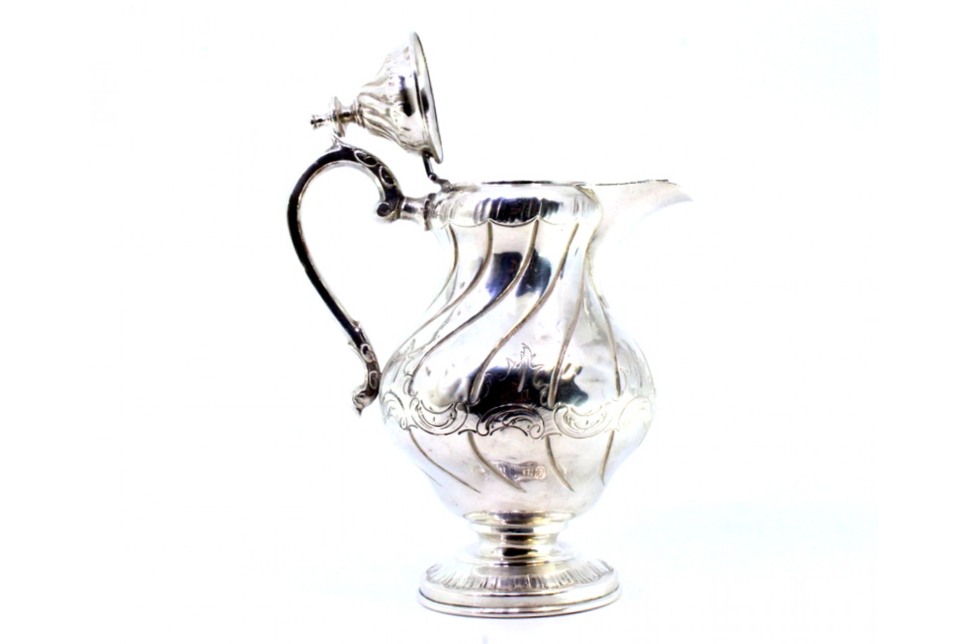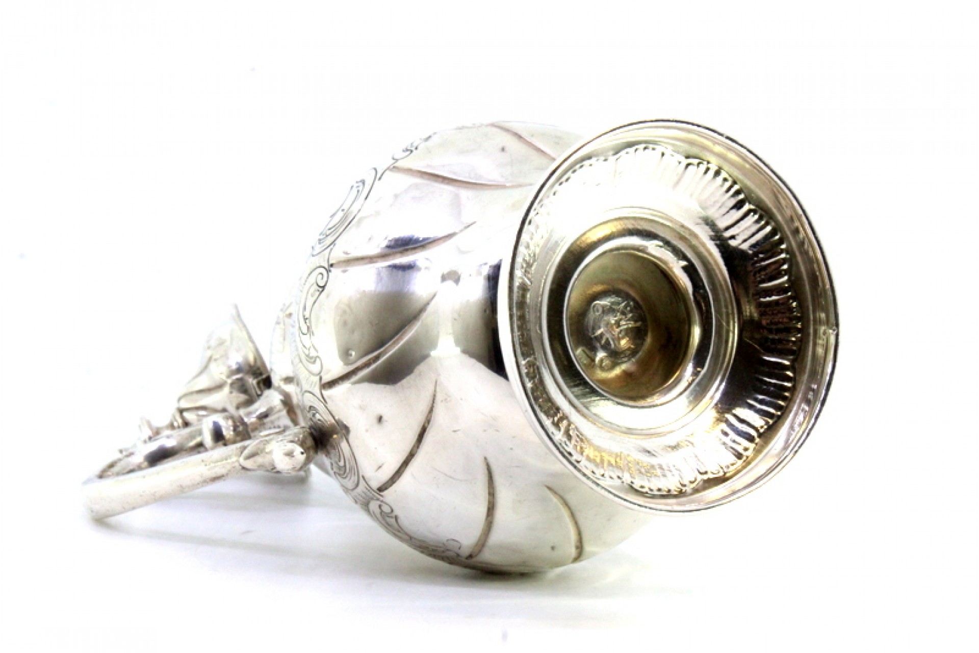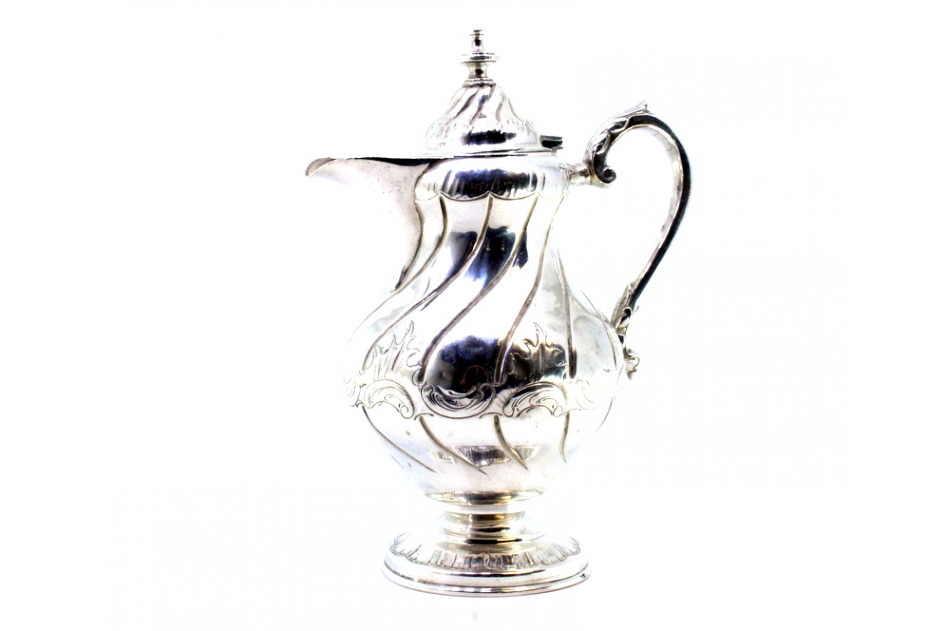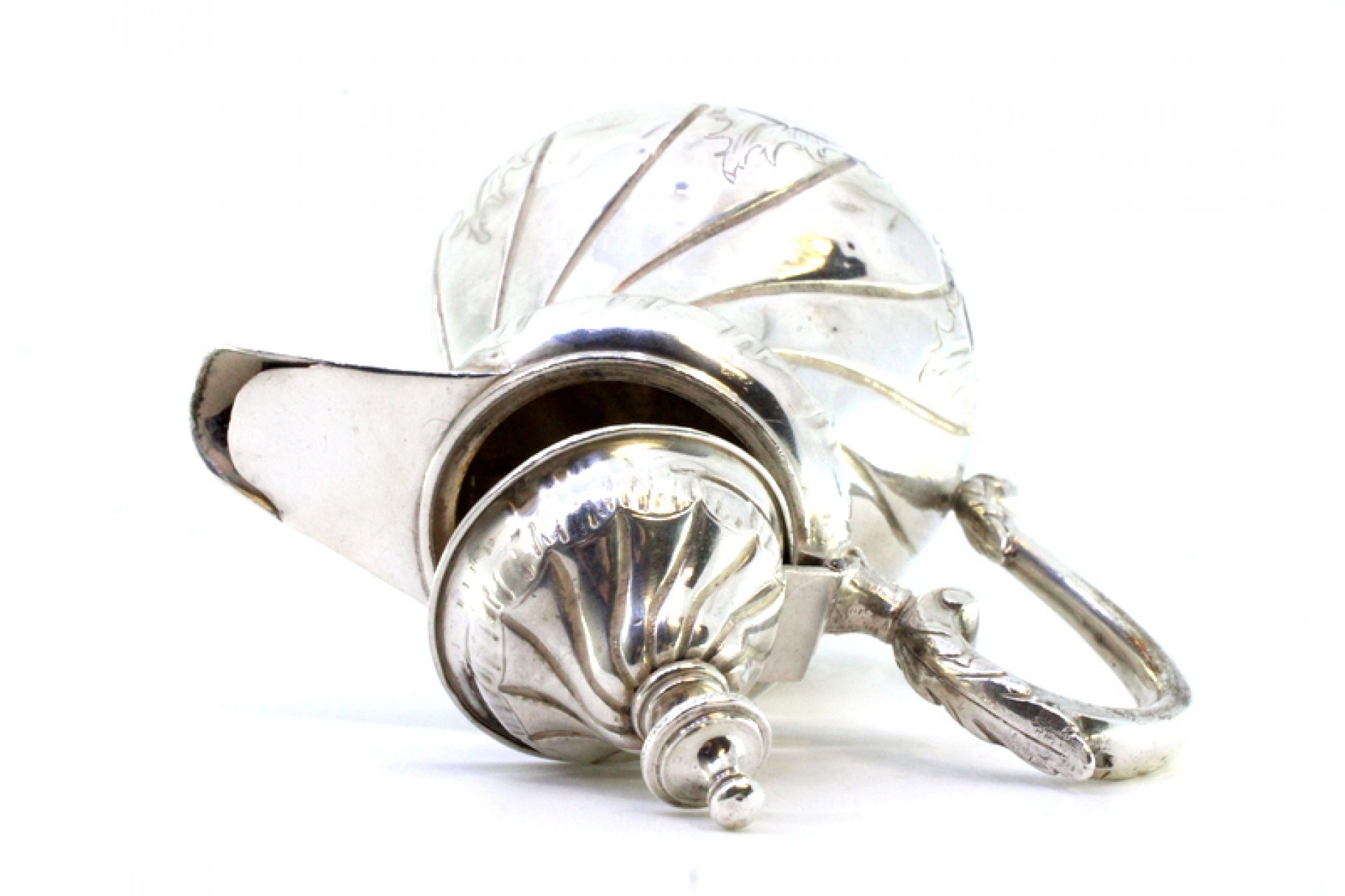 • Descrição: Cafeteira em prata com frisos gomados gravados, pomo na tampa e assente em base circular.