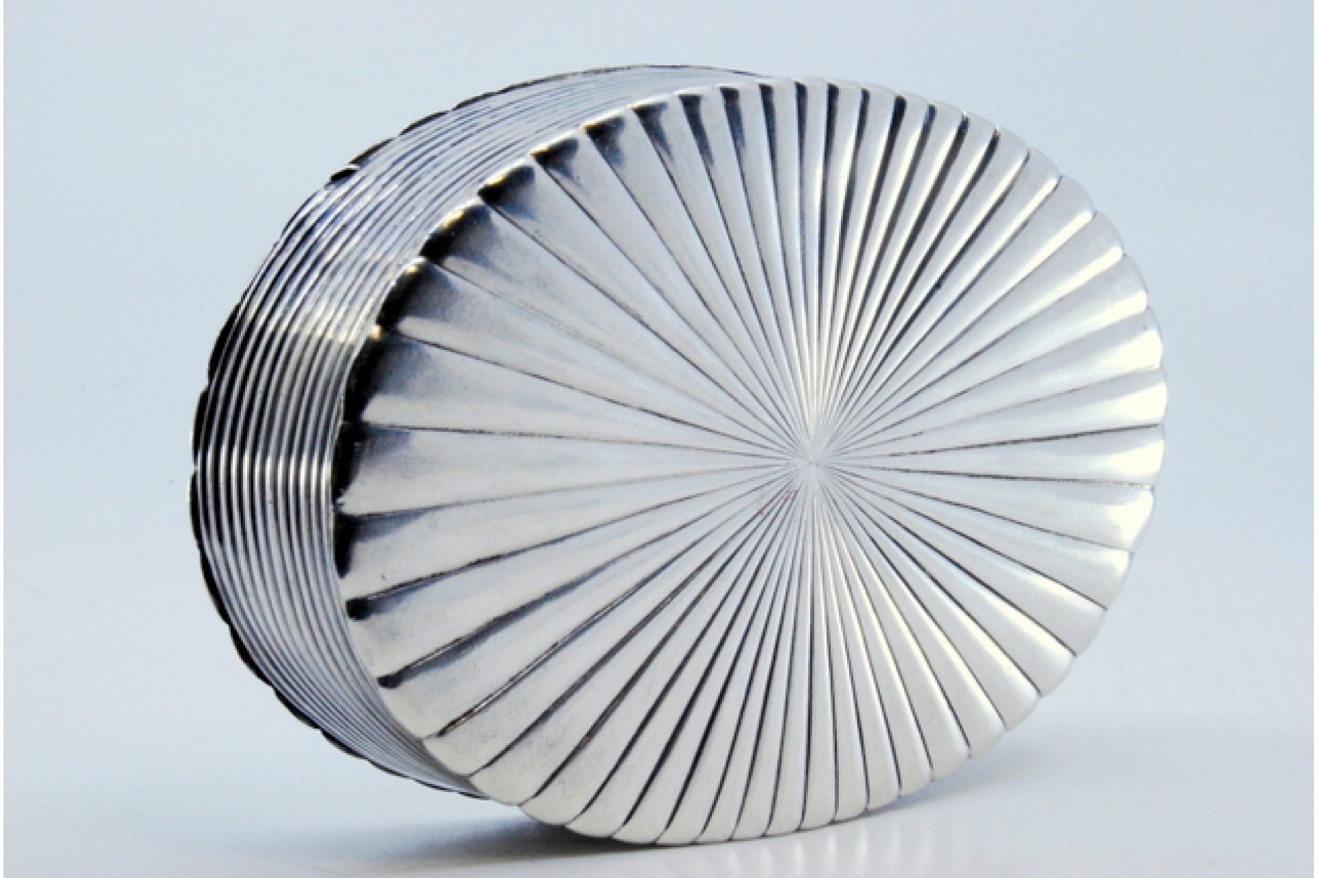 Caixa para alfinetes em prata com relevos em forma de vórtice.
