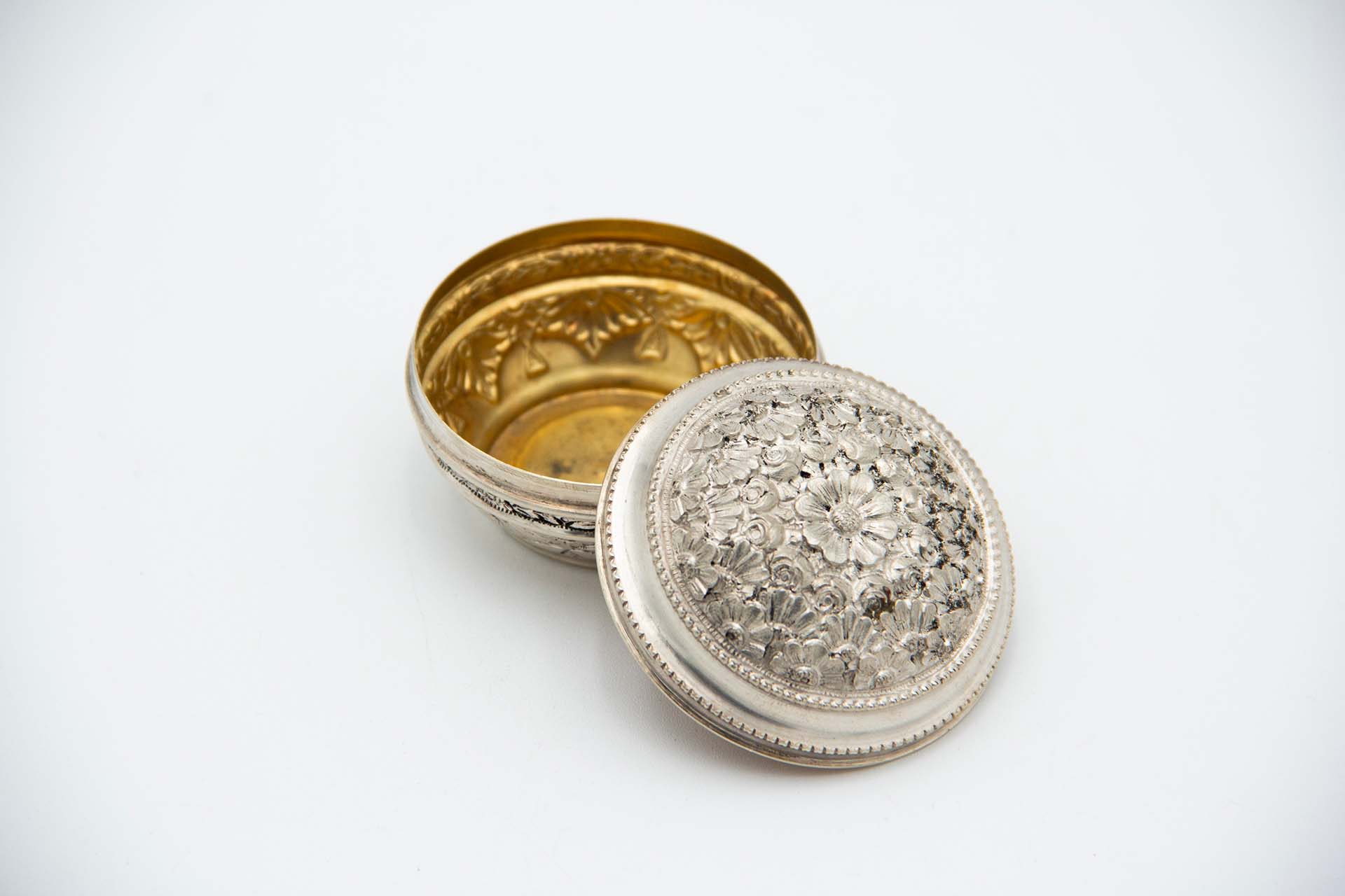 Caixa de forma circular em prata com relevos de flores na tampa e dourada no interior