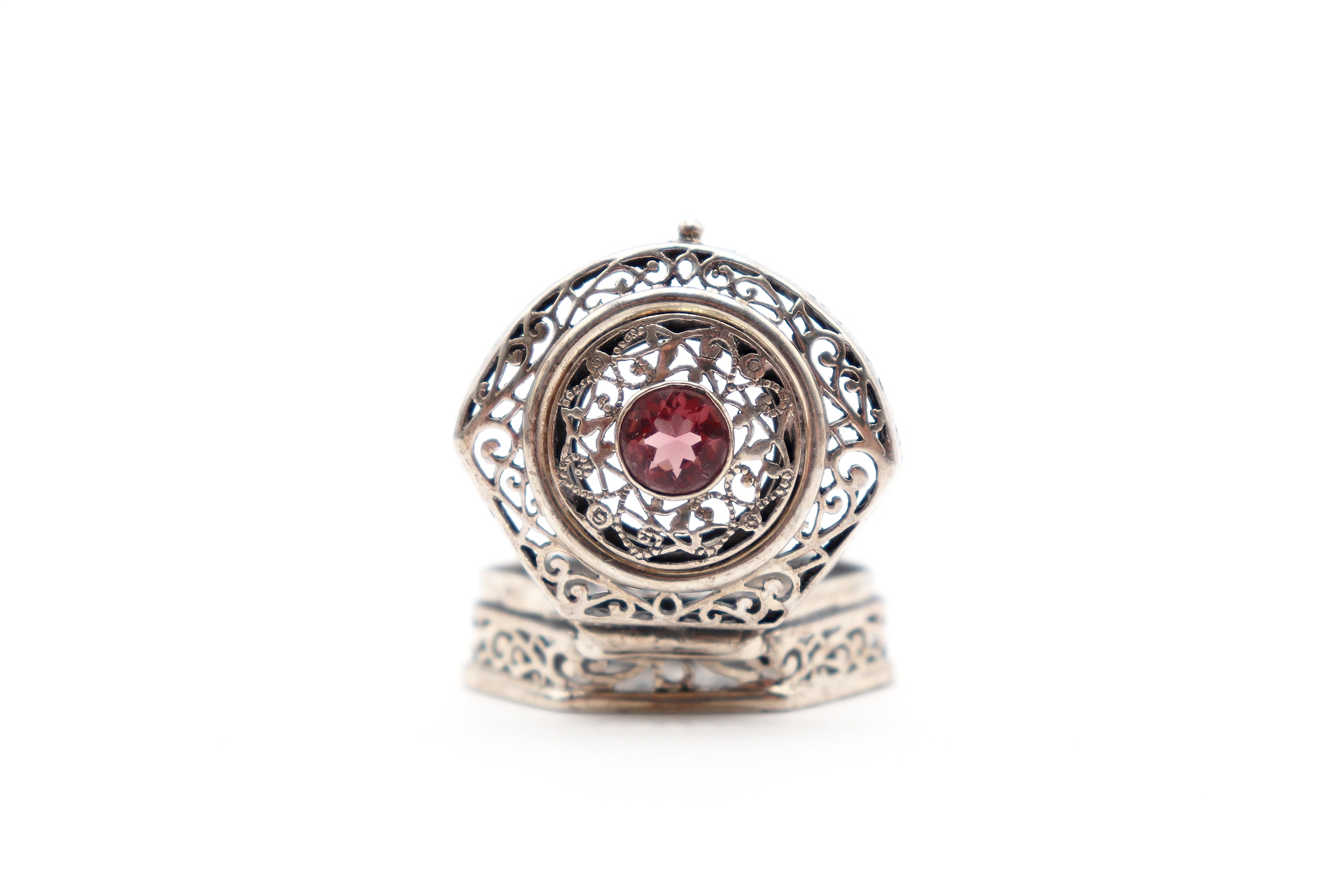 • Descrição: Caixa de comprimidos em prata recortada com aplicação de pedra púrpura na tampa.