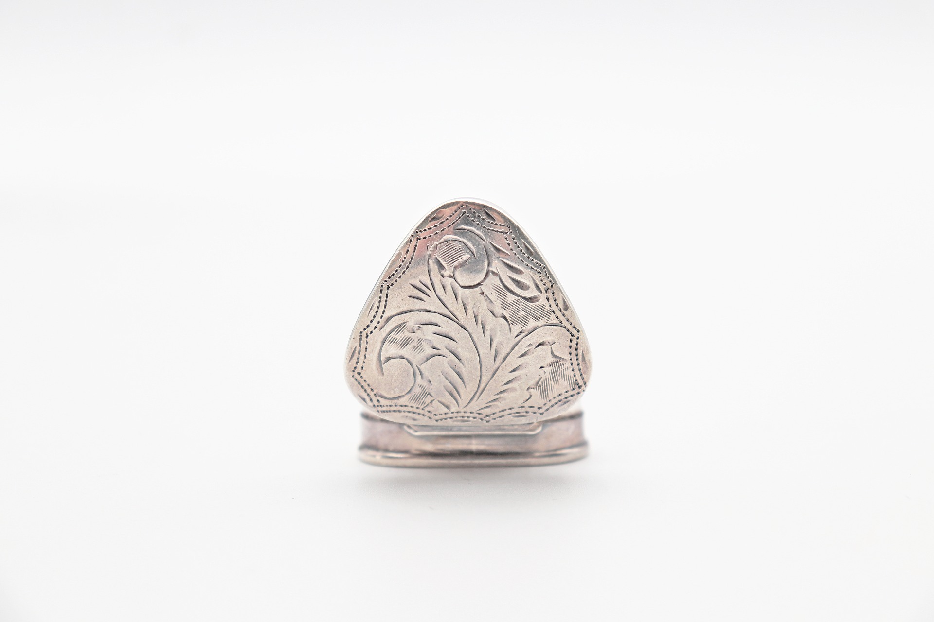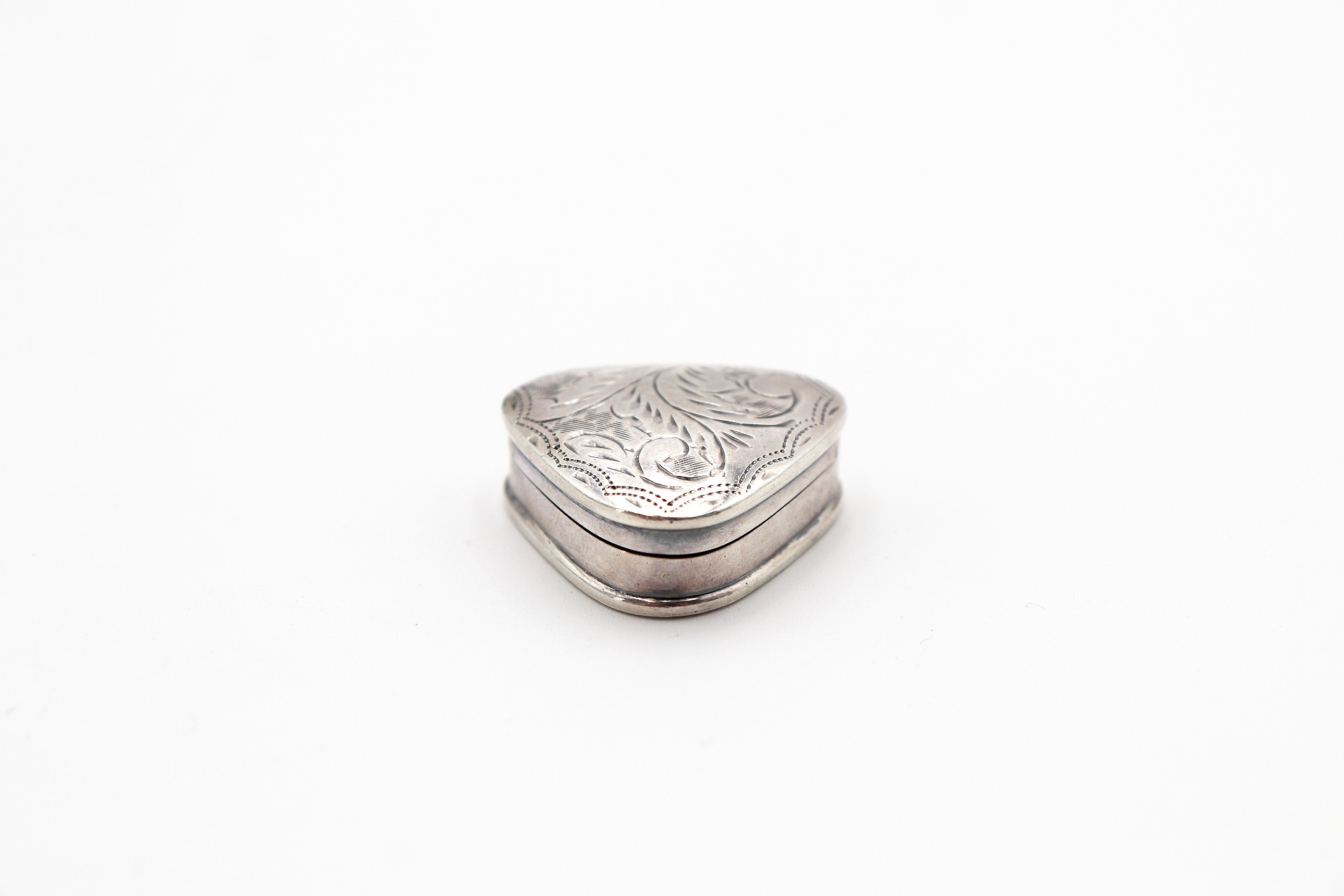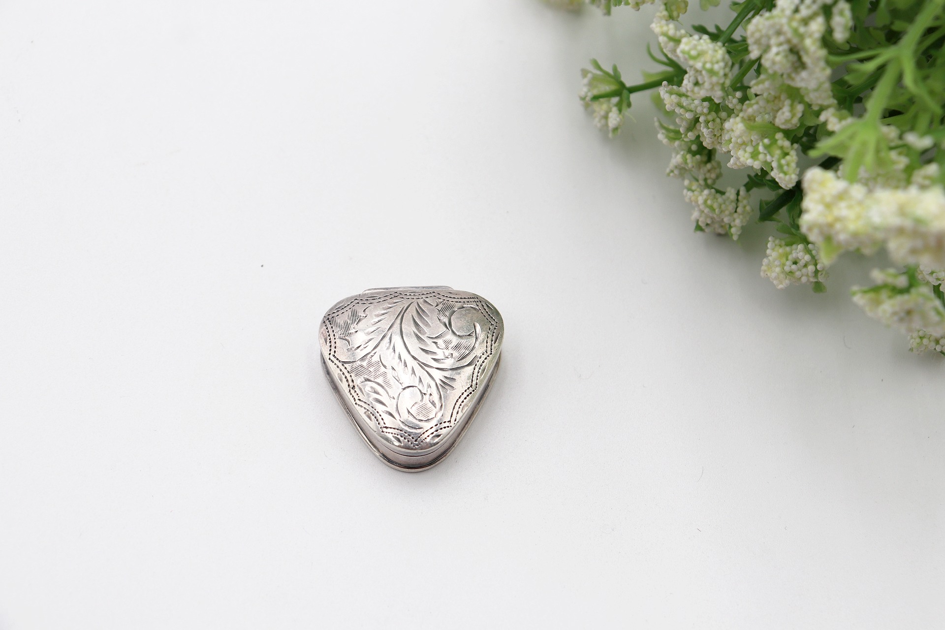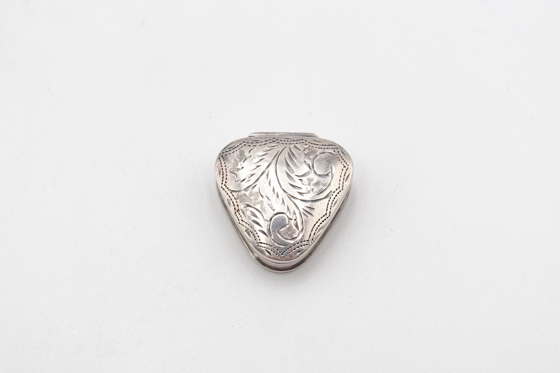 Caixa de comprimidos em prata triangular com gravados na tampa basculante