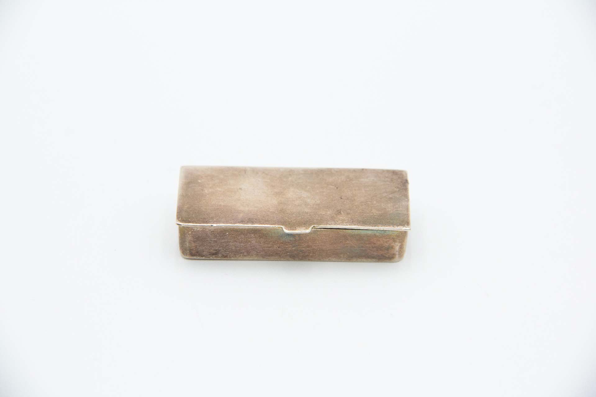 • Descrição: Caixa de comprimidos retangular de prata lisa e tampa basculante.