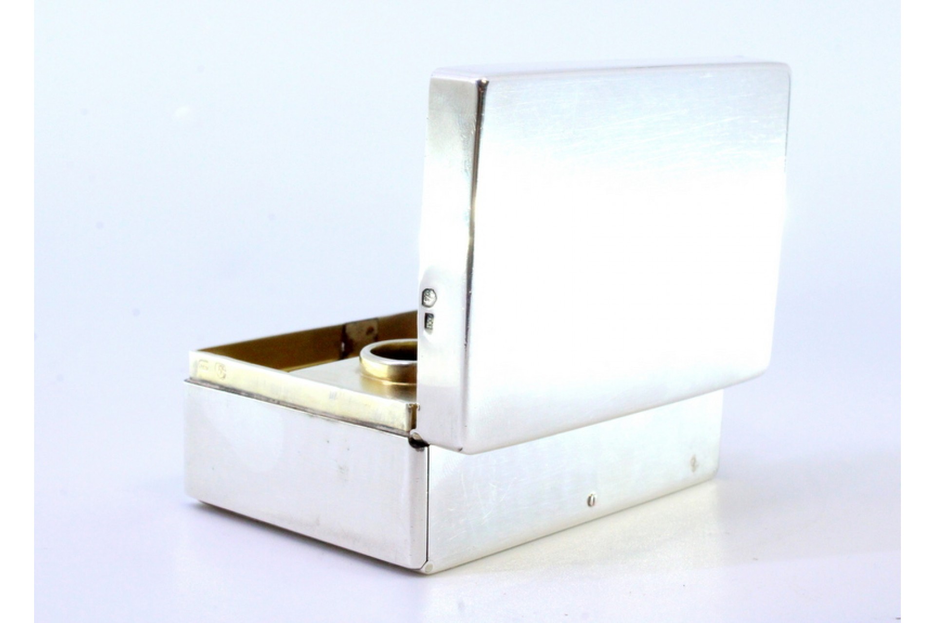 • Descrição: Caixa de toilette em prata para baton, vela, fosforeira, depósito para fósforos usados e interior em dourado com tampa basculante.