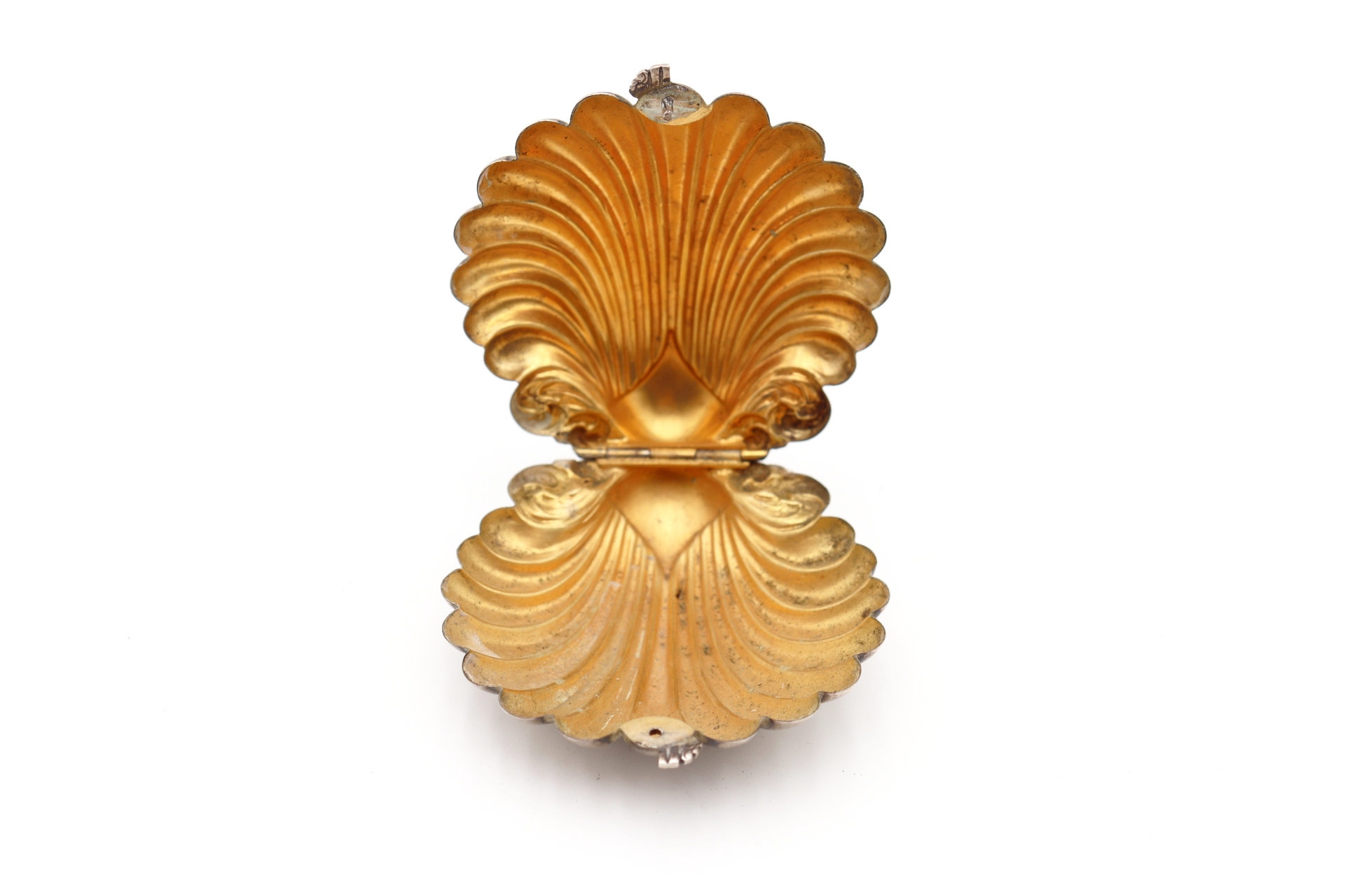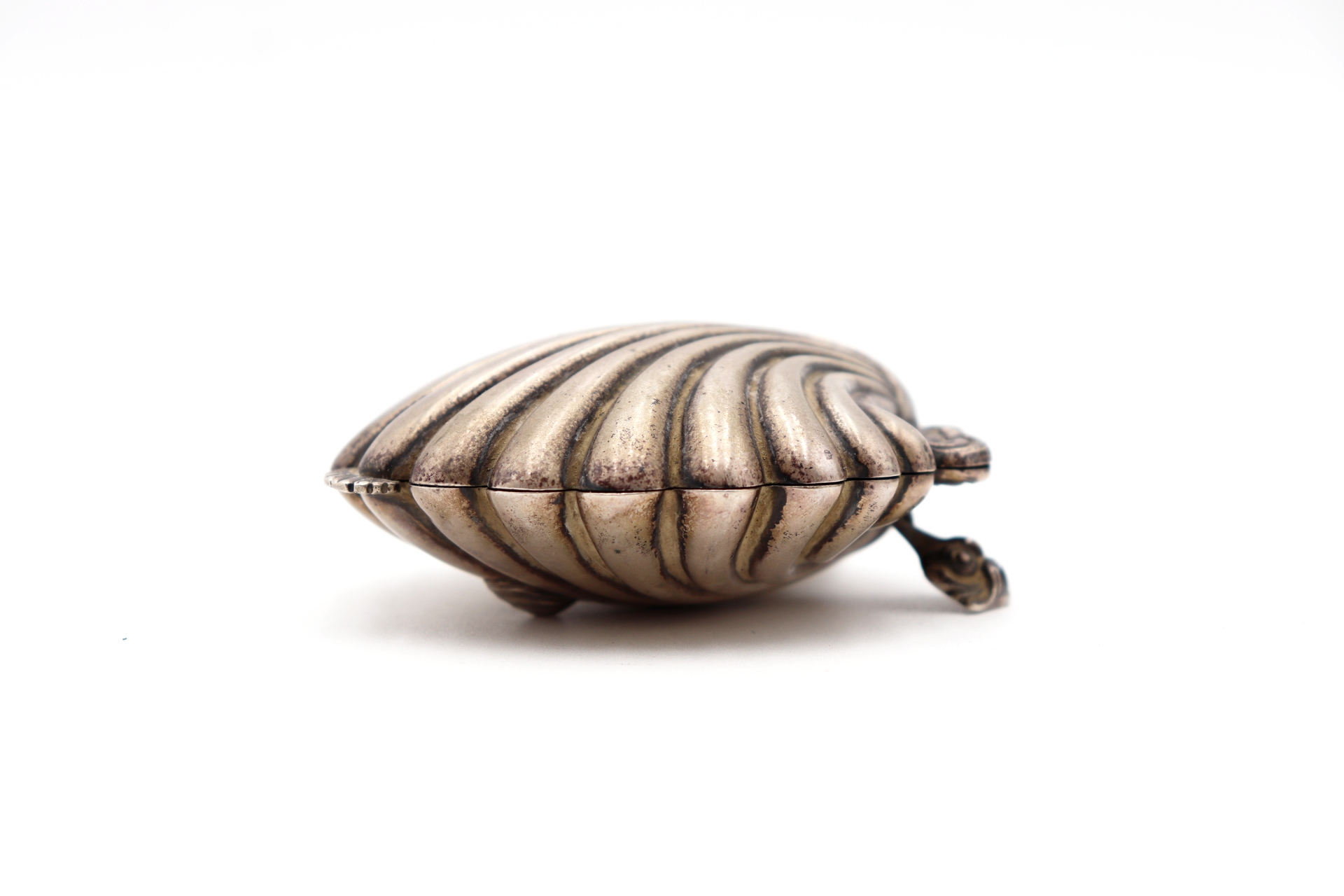 Caixa de prata em forma de concha assente em três pés com mascarões