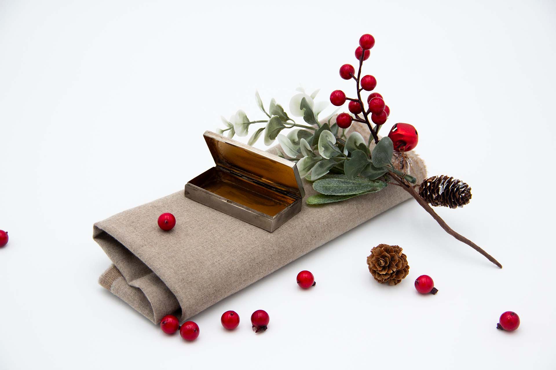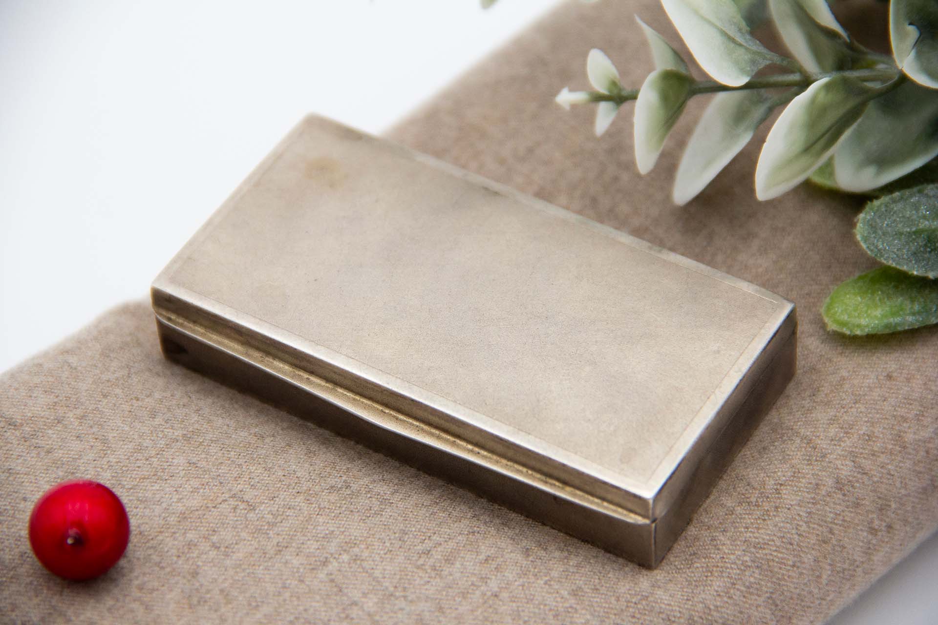 • Descrição: Caixa de rapé em prata fosca com interior dourado.