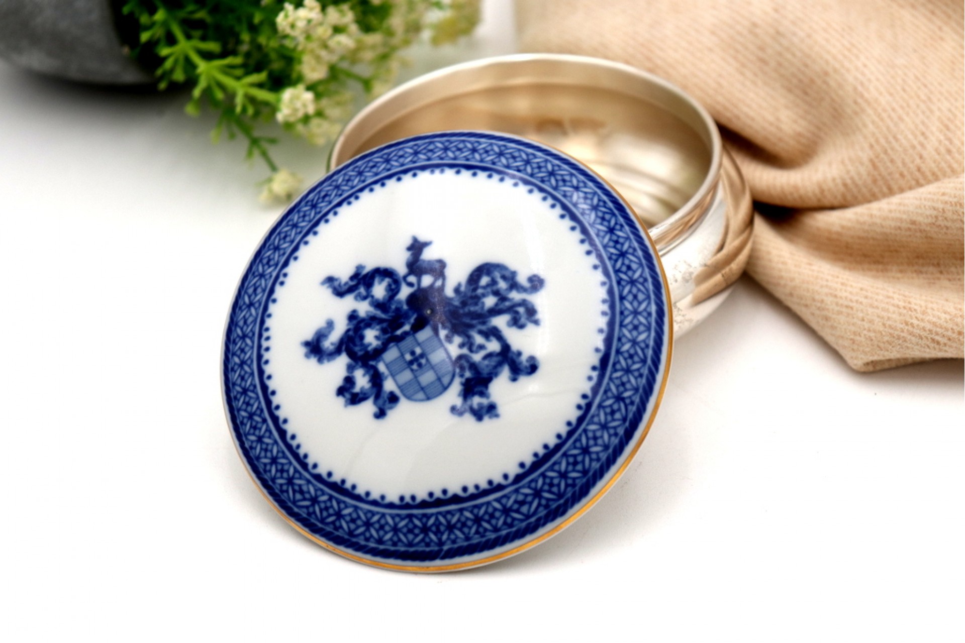 • Descrição: Caixa em prata circular com tampa em porcelana da companhia das índias