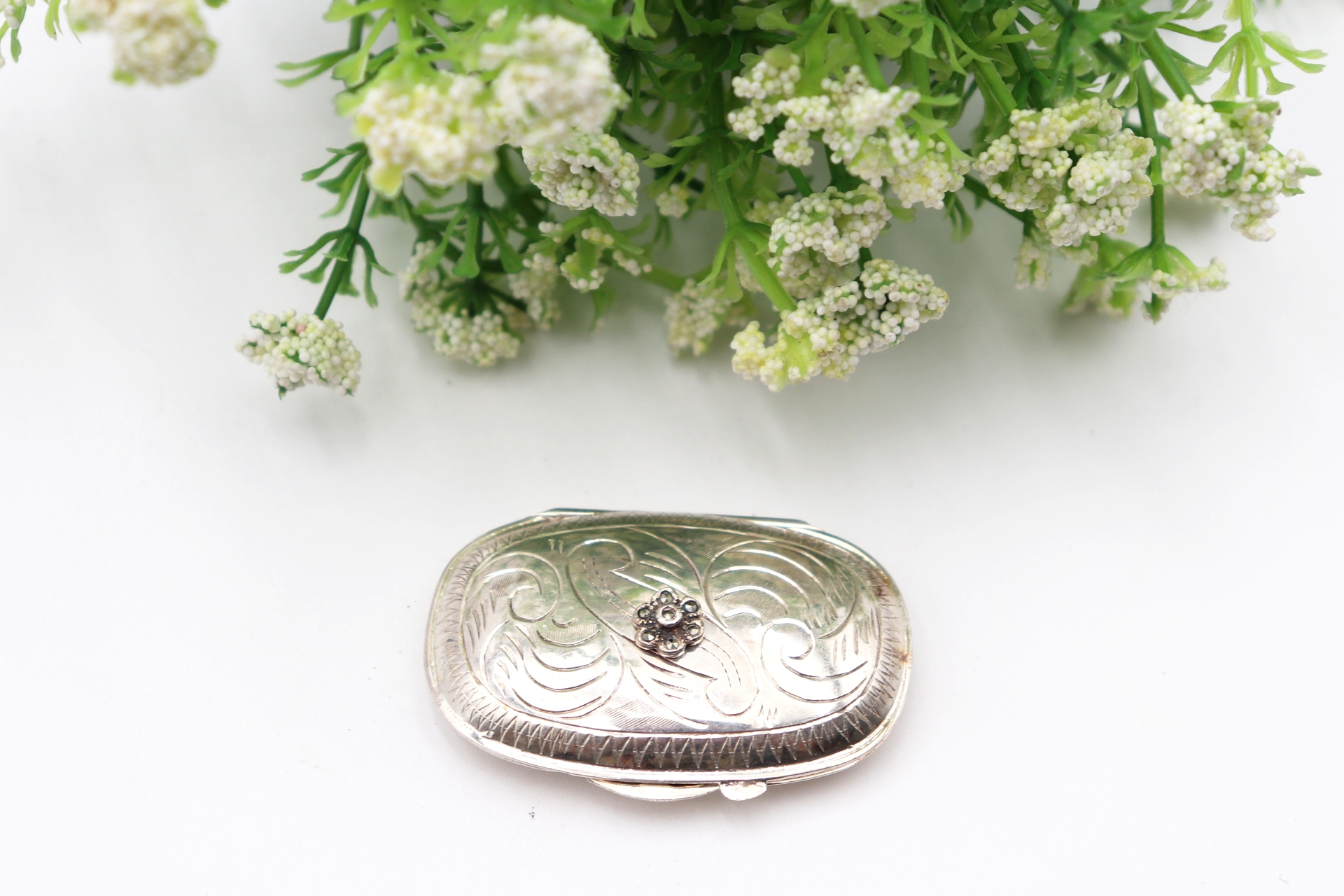 Caixa de comprimidos em prata com gravados e pedra em forma de flor