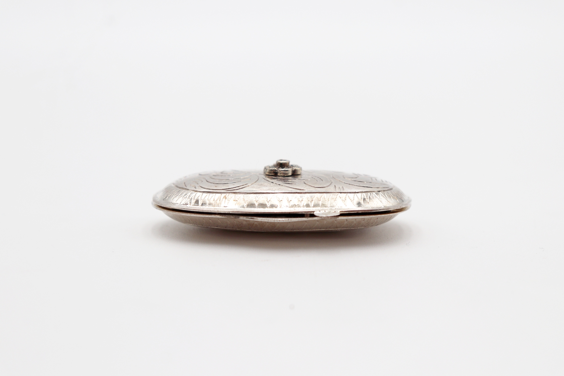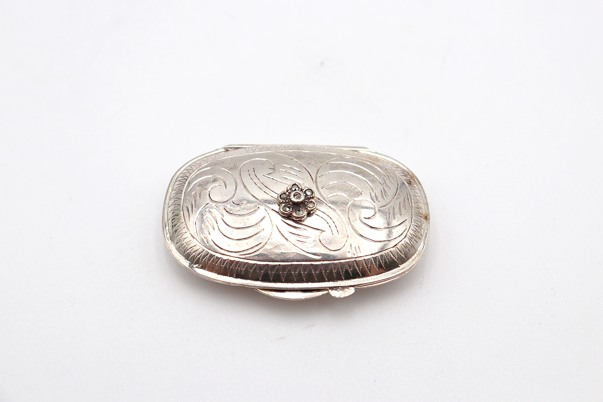 • Descrição: Caixa de comprimidos em prata com gravados e pedra em forma de flor.