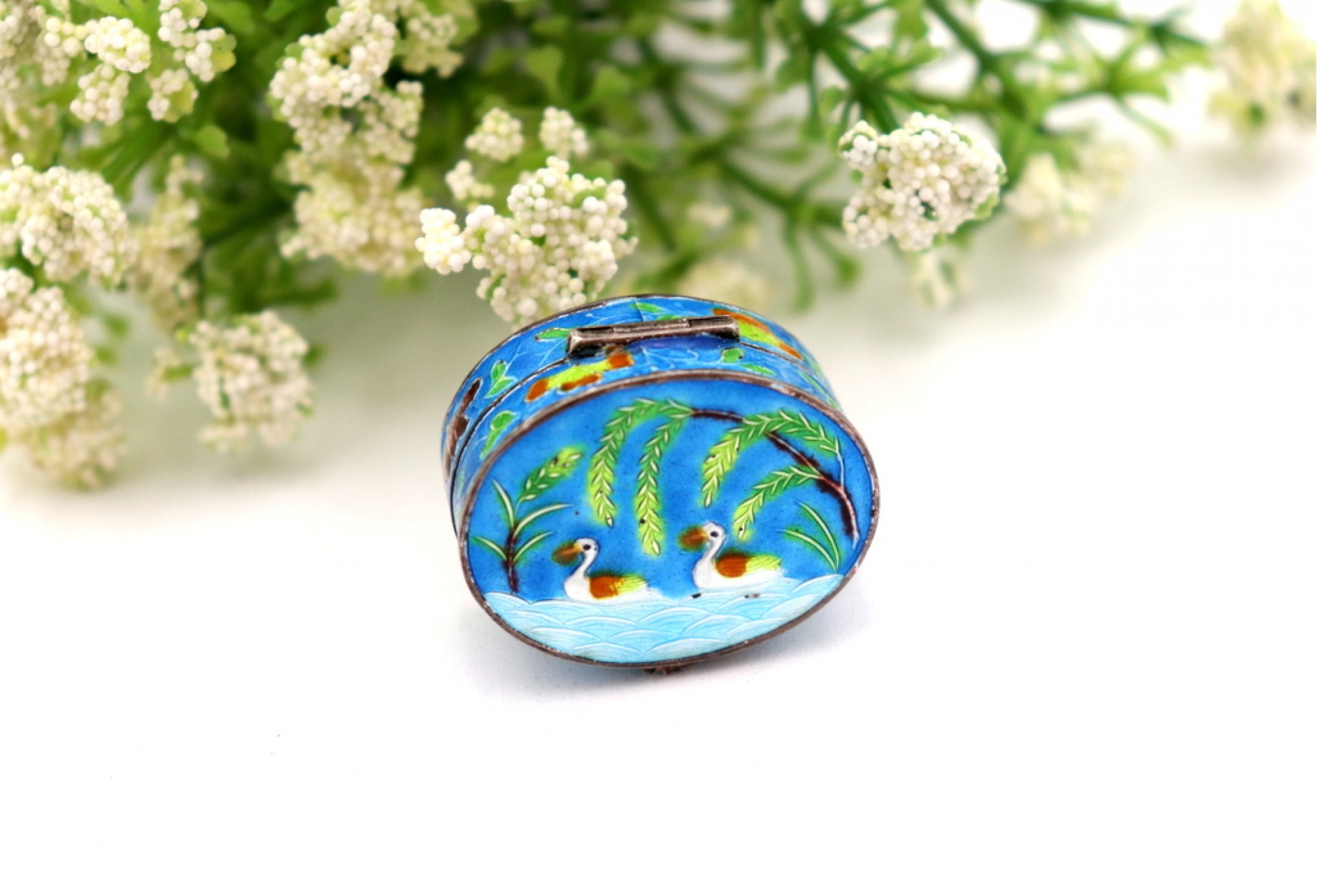 • Descrição: Caixa de comprimidos em prata esmaltada com dois patos na tampa basculante.