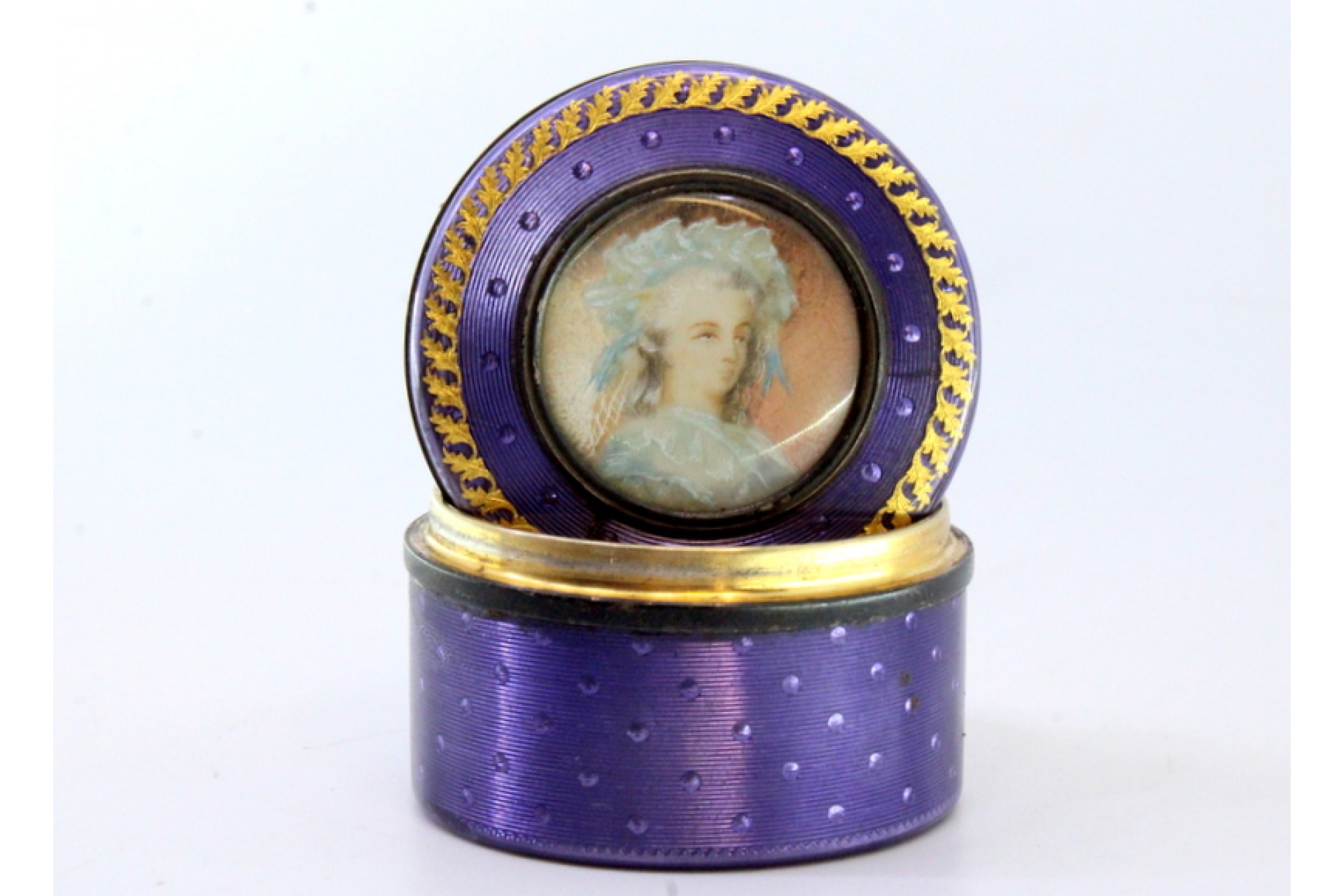 • Descrição: Caixa de comprimidos em prata envolvida por esmalte envolvendo jovem Senhora na tampa basculante com friso e interior dourados.
