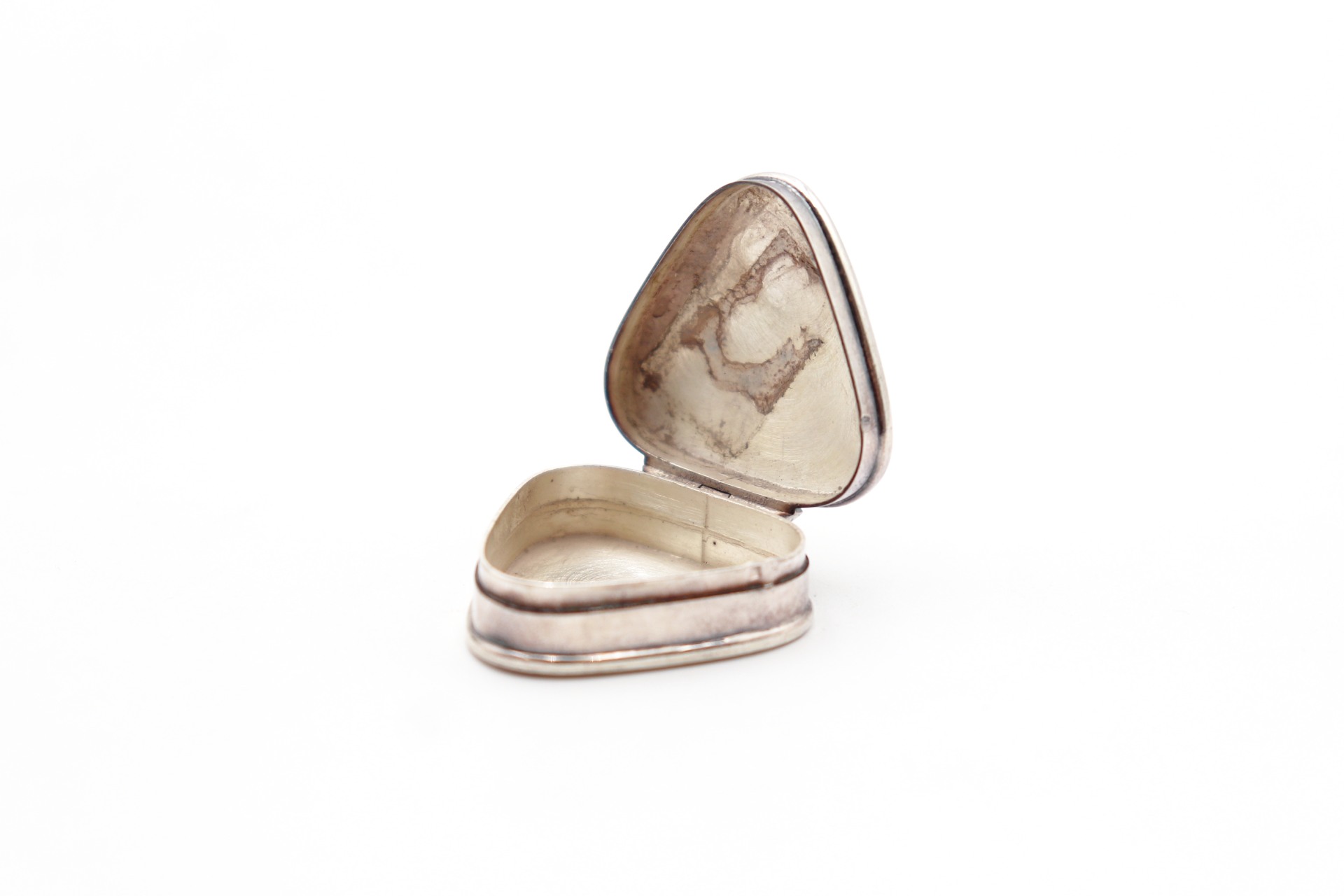• Descrição: Caixa de comprimidos triangular de prata com gravados vegetalistas.