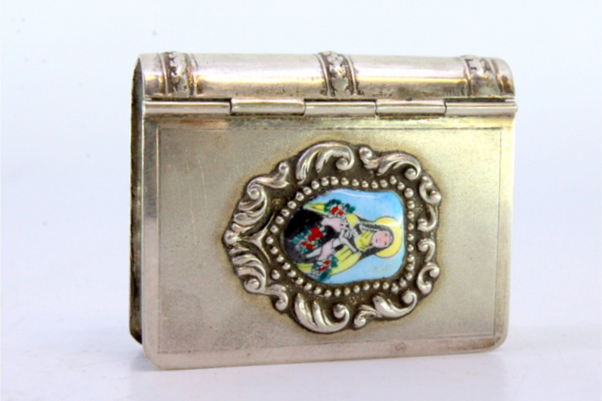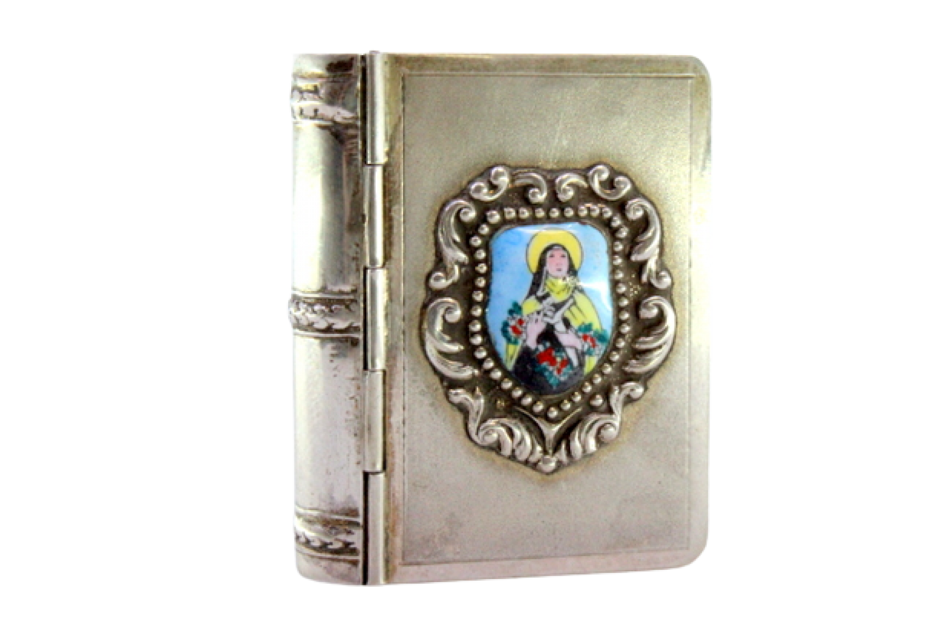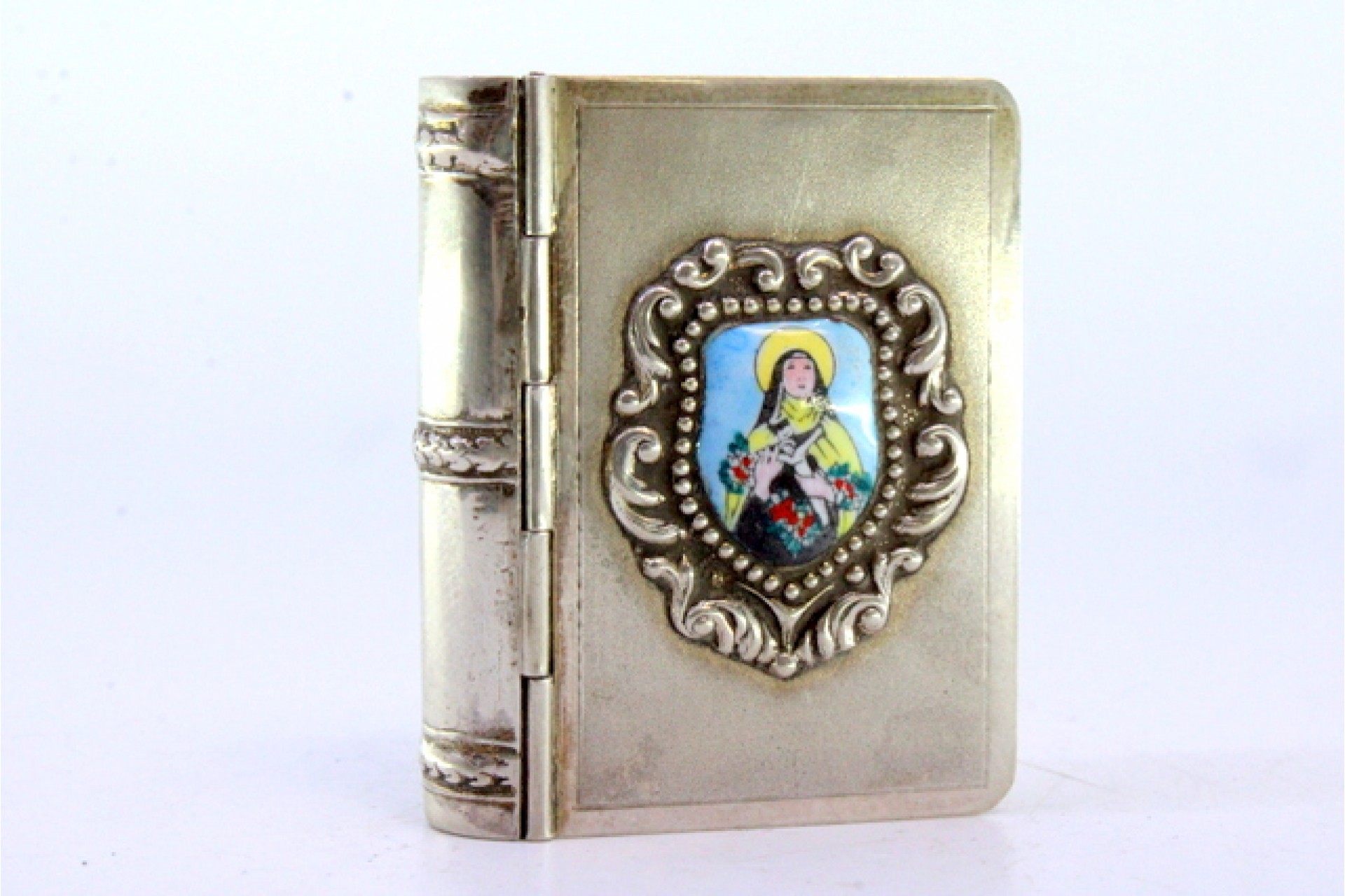 • Descrição: Caixa para comprimidos em prata em forma de livro com figura de Santa em esmalte na tampa.