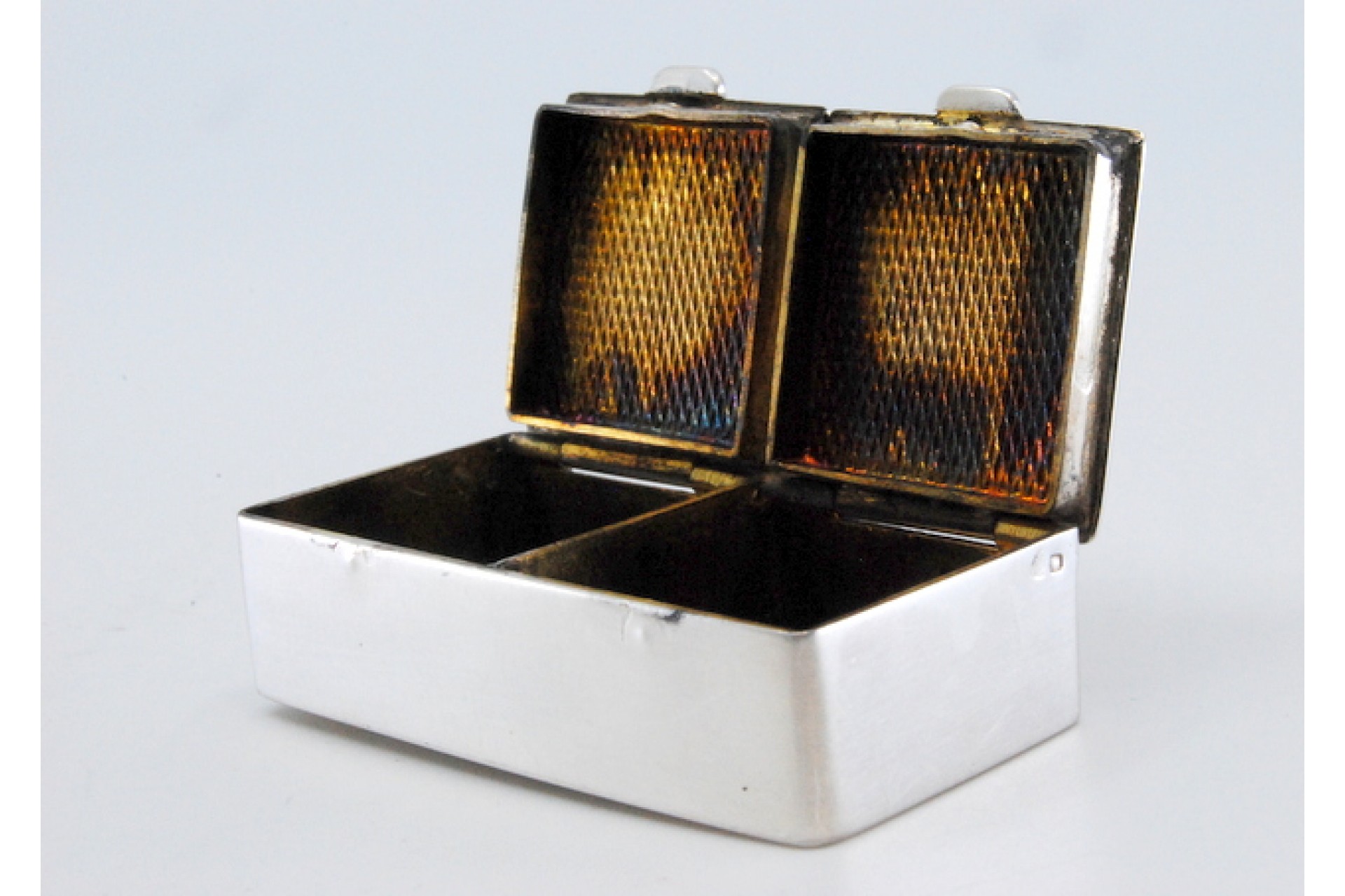 • Descrição: Caixa de comprimidos em prata guilhochada com duas divisórias e tampas basculantes.