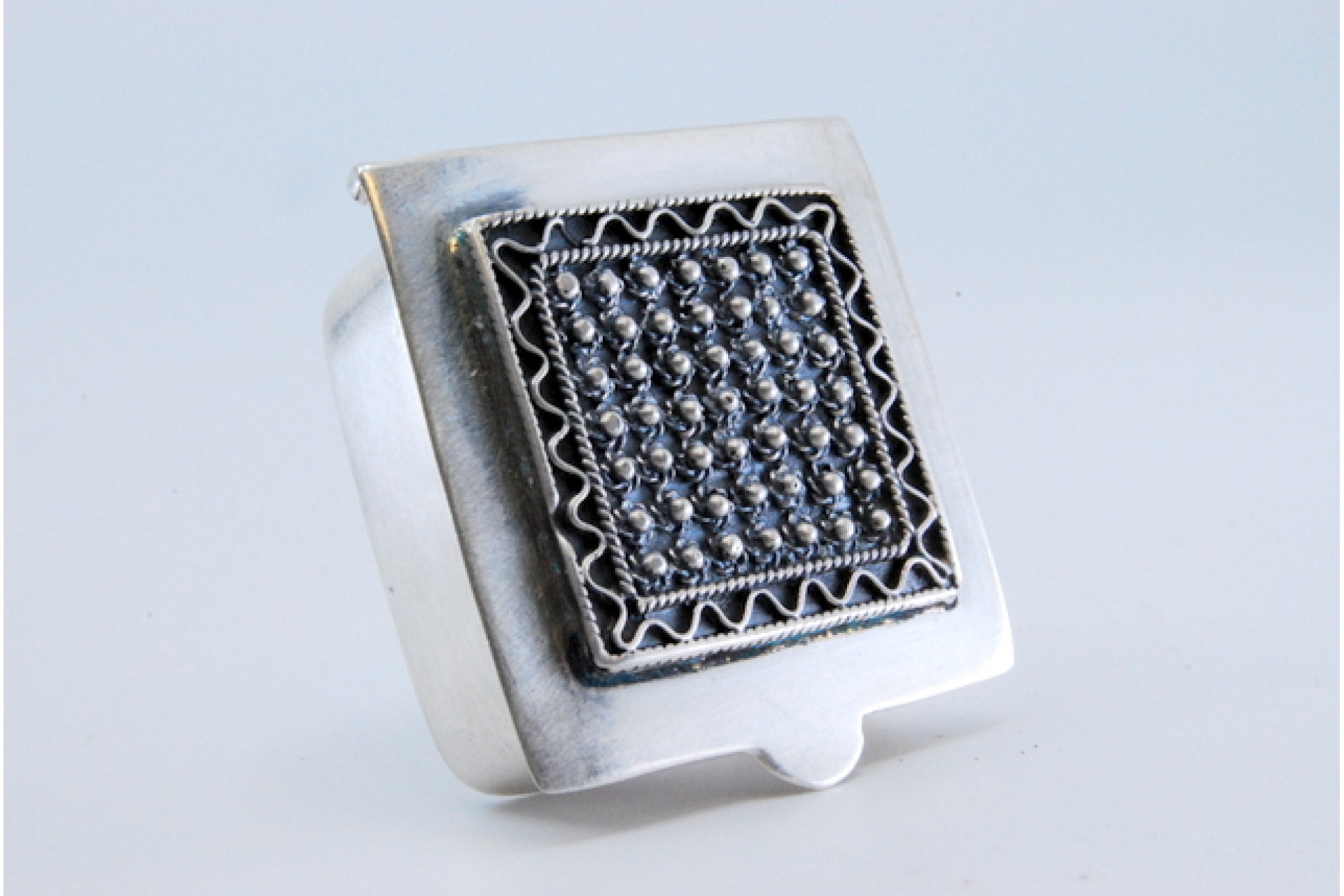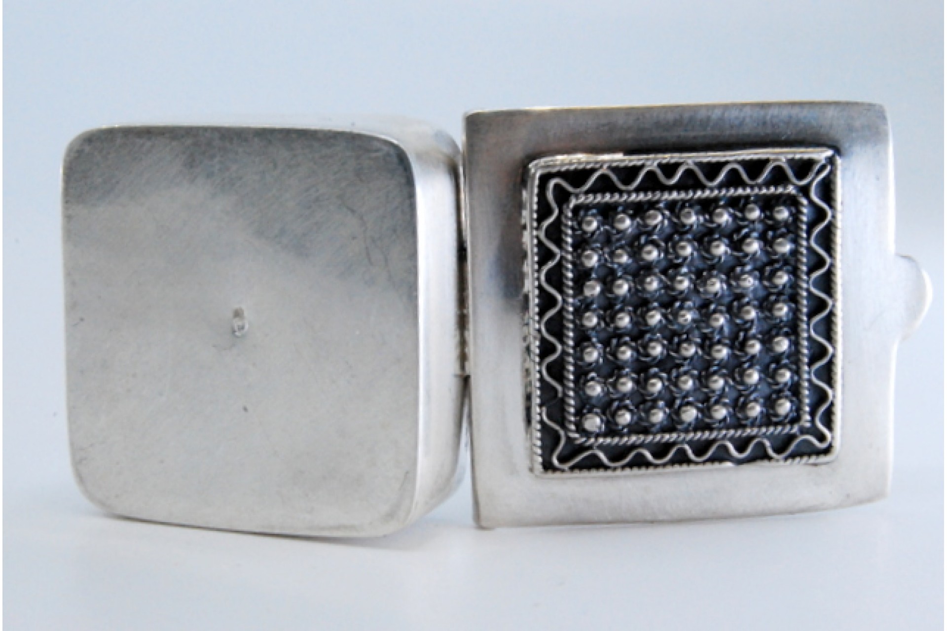 • Descrição: Caixa de comprimidos em prata lisa em forma quadrada com aplicações relevadas na tampa basculante.