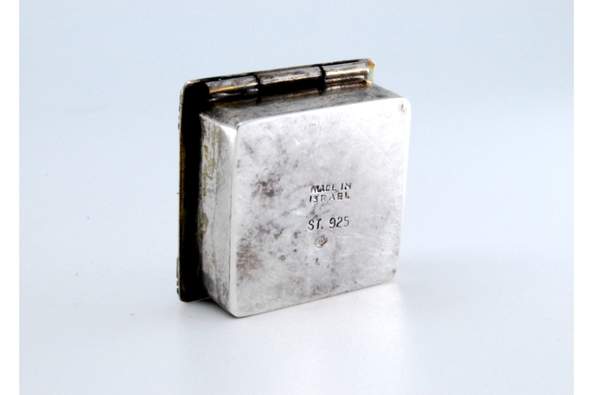 Caixa de comprimidos em prata de forma quadrada com aplicações relevadas na tampa basculante.