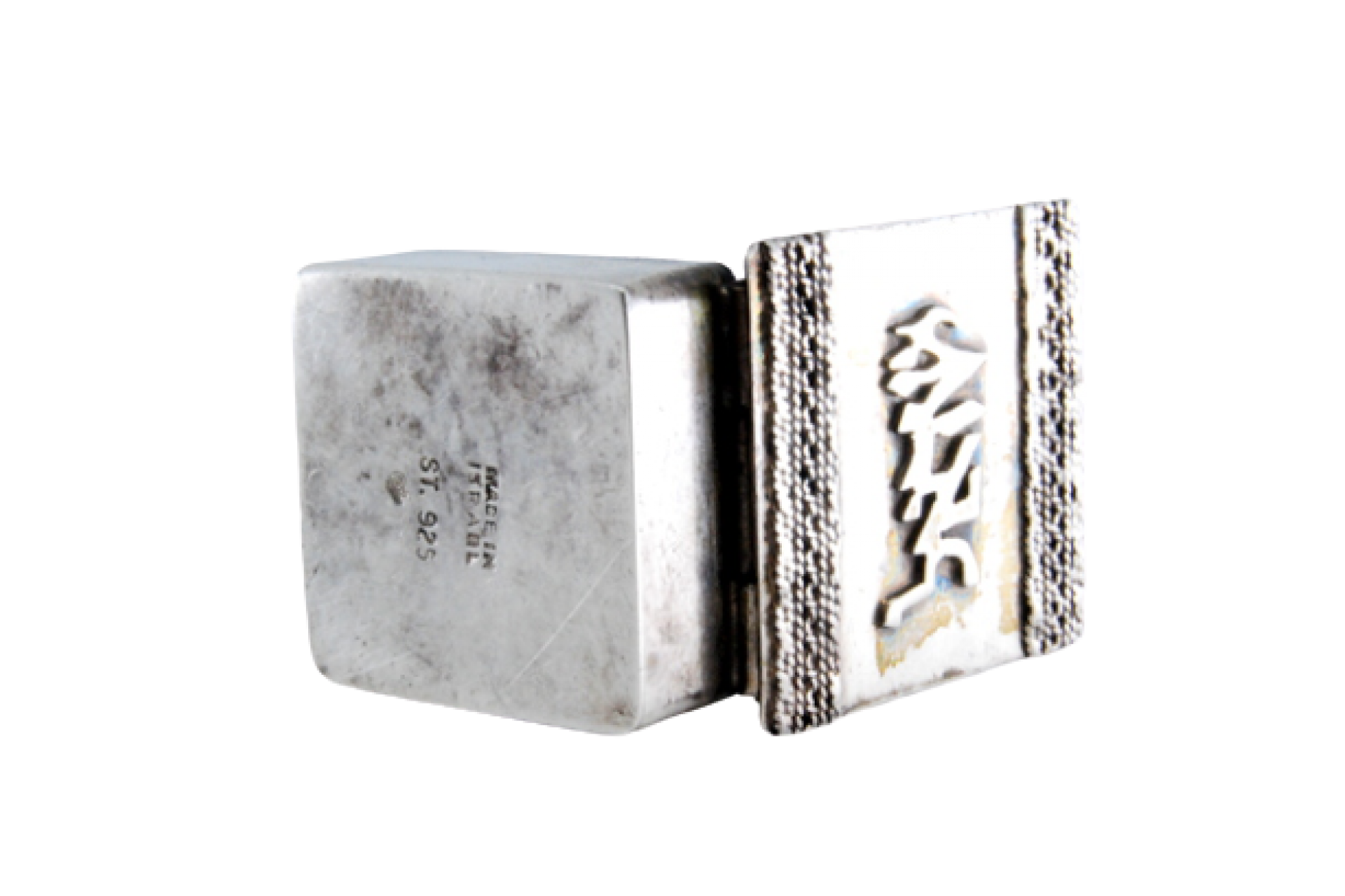 • Descrição: Caixa de comprimidos em prata de forma quadrada com aplicações relevadas na tampa basculante.