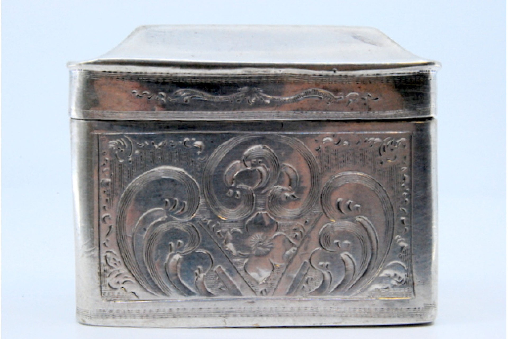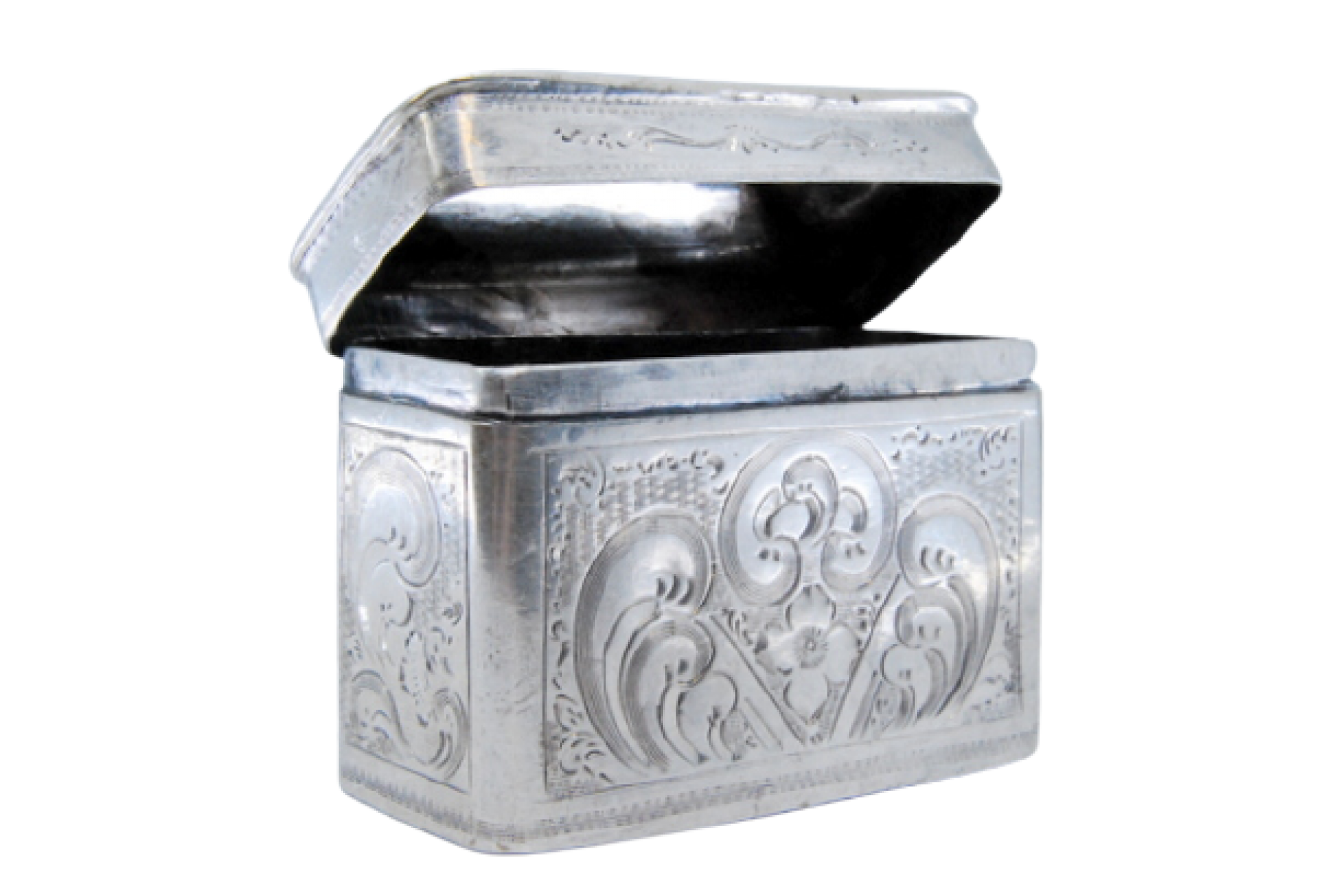 Caixa de comprimidos em prata com motivos vegetalistas gravados e tampa basculante.