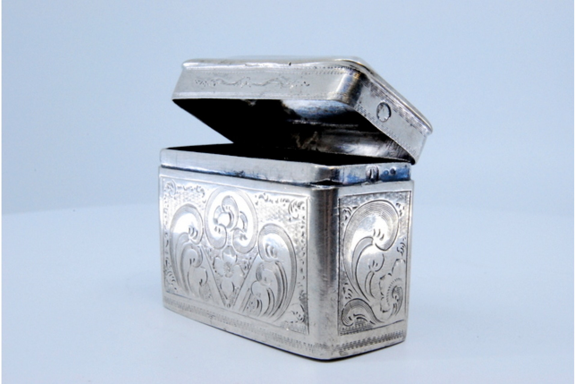 • Descrição: Caixa de comprimidos em prata com motivos vegetalistas gravados e tampa basculante.