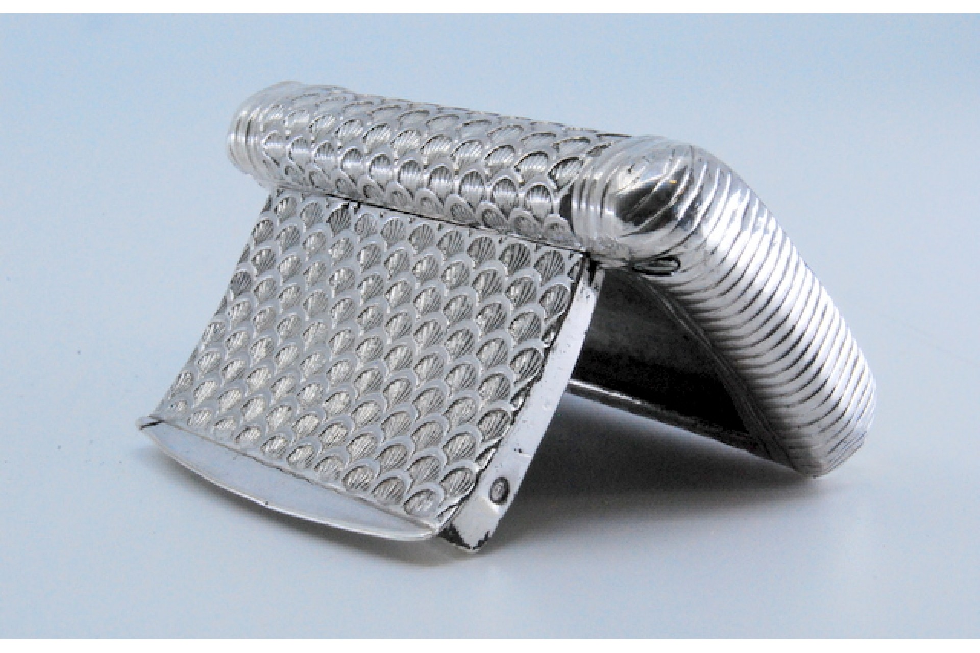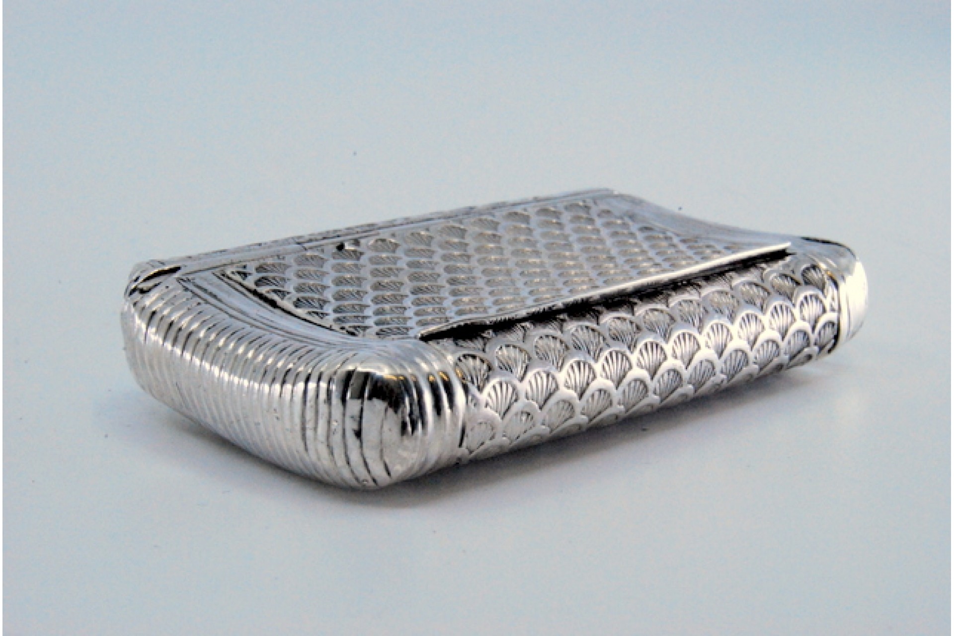 • Descrição: Caixa de rapé em prata cinzelada com meias conchas e tampa basculante.