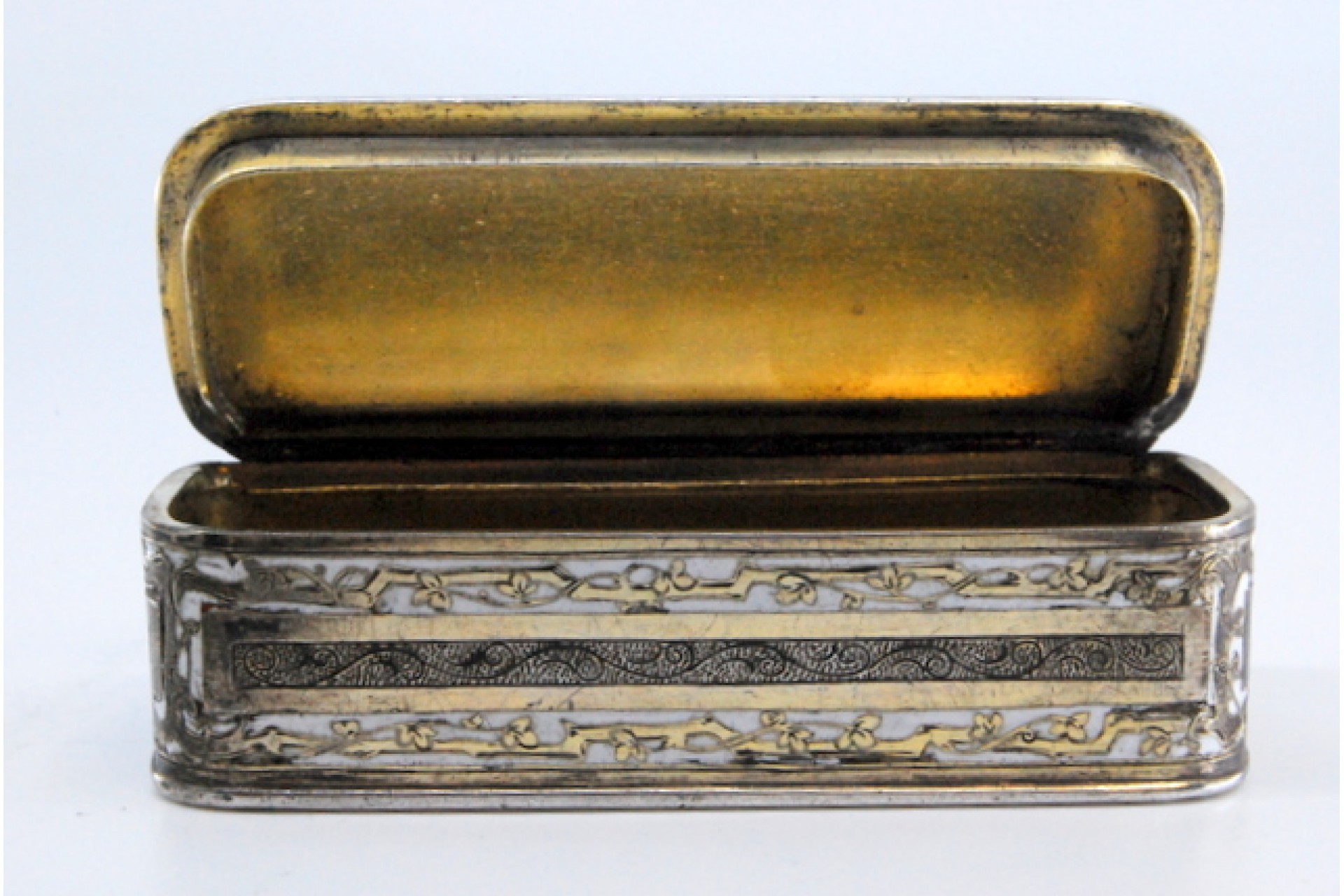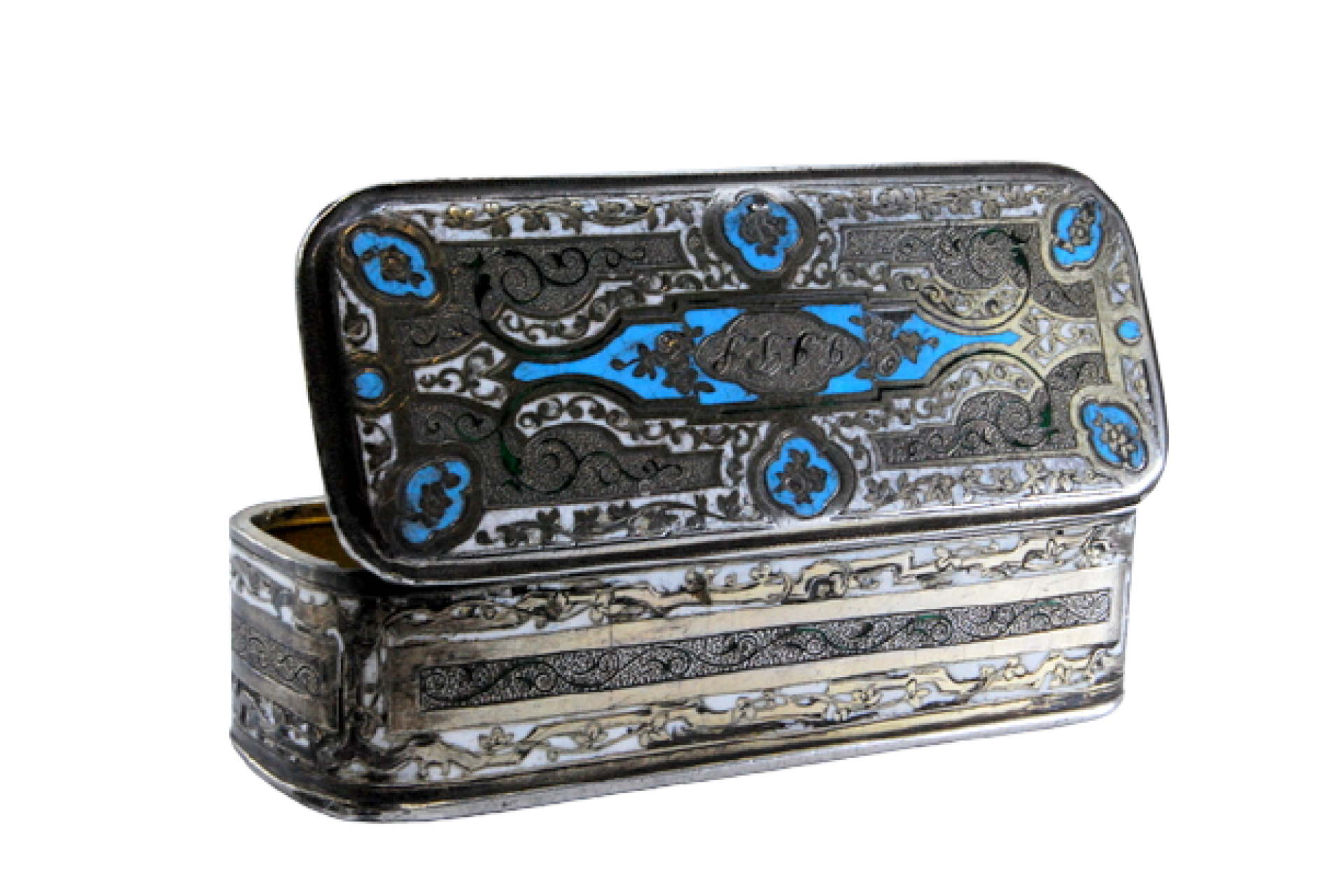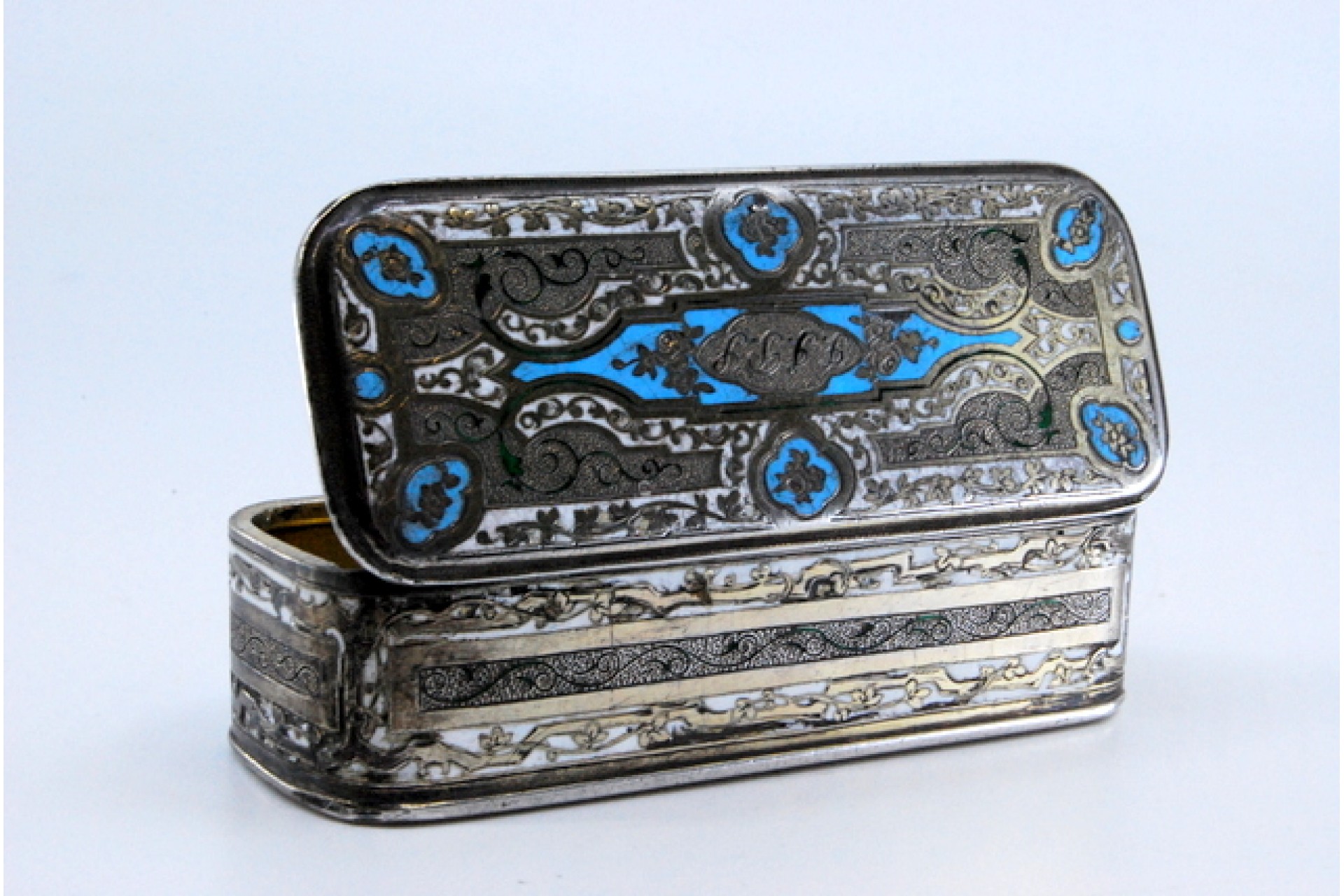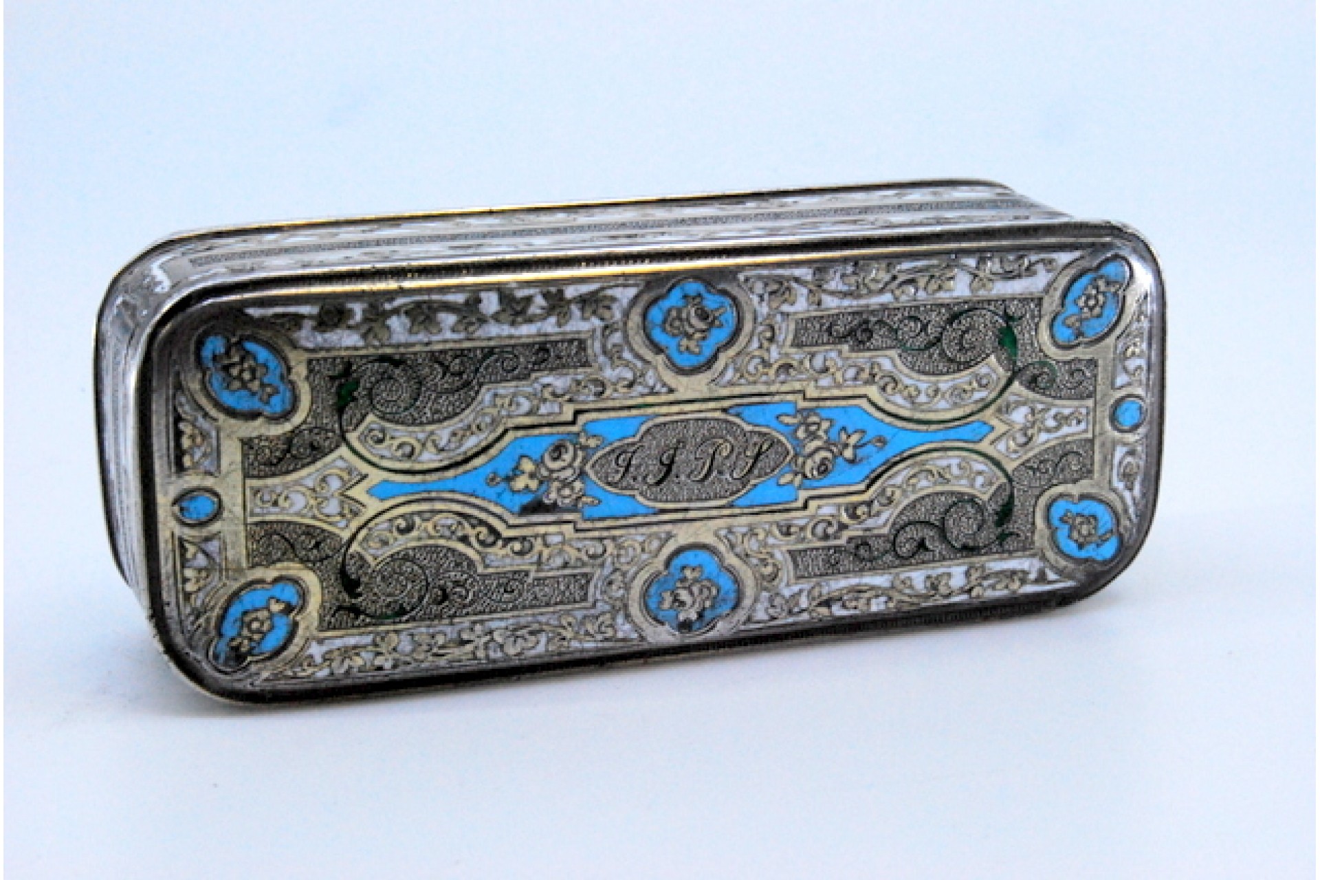 • Descrição: Caixa de rapé em prata com aplicações esmaltadas em azul e interior dourado.