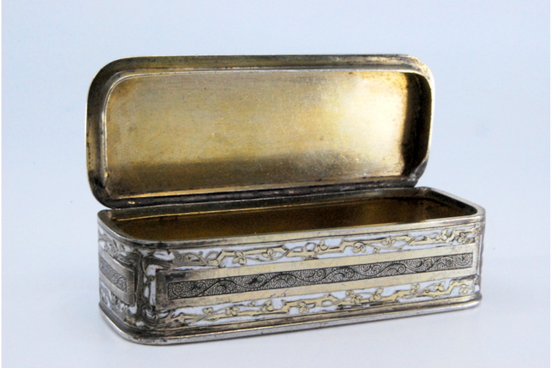 Caixa de rapé em prata com aplicações esmaltadas em azul e interior dourado.