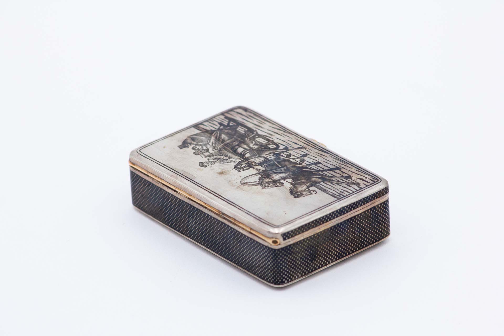 • Descrição: Caixa de rapé em prata anielada com transporte de viajantes em carro de tração animal ao gosto Russo e fecho em ouro.