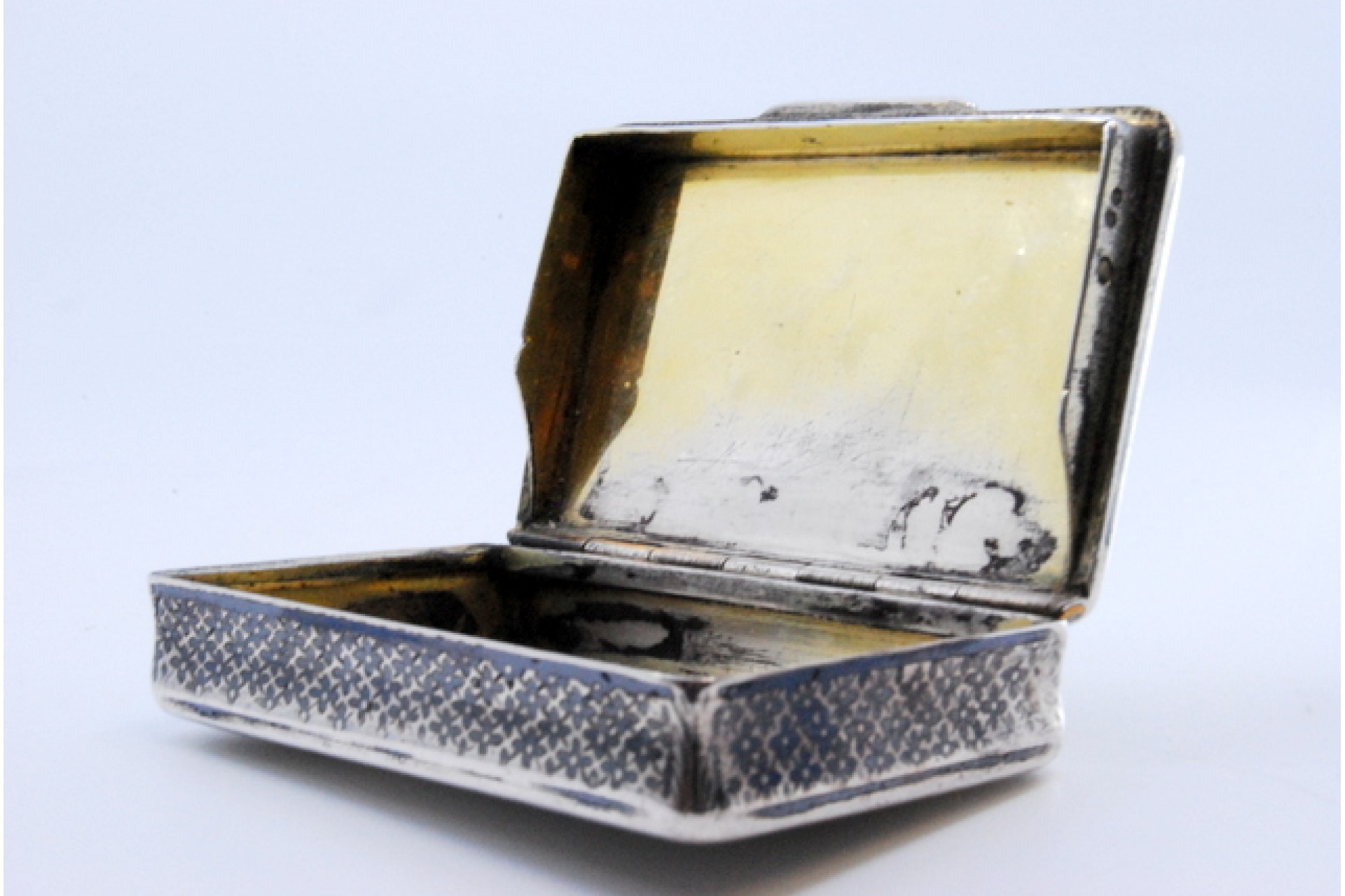 • Descrição: Caixa de rapé em prata nielada com interior dourado e tampa basculante.