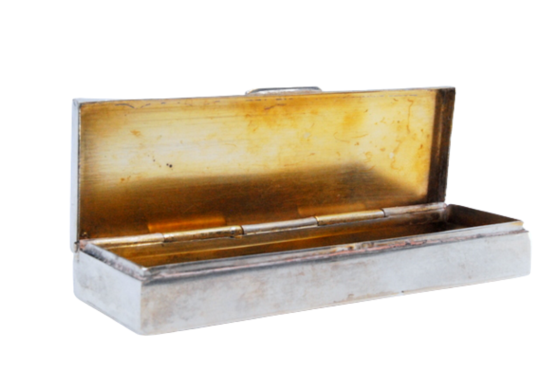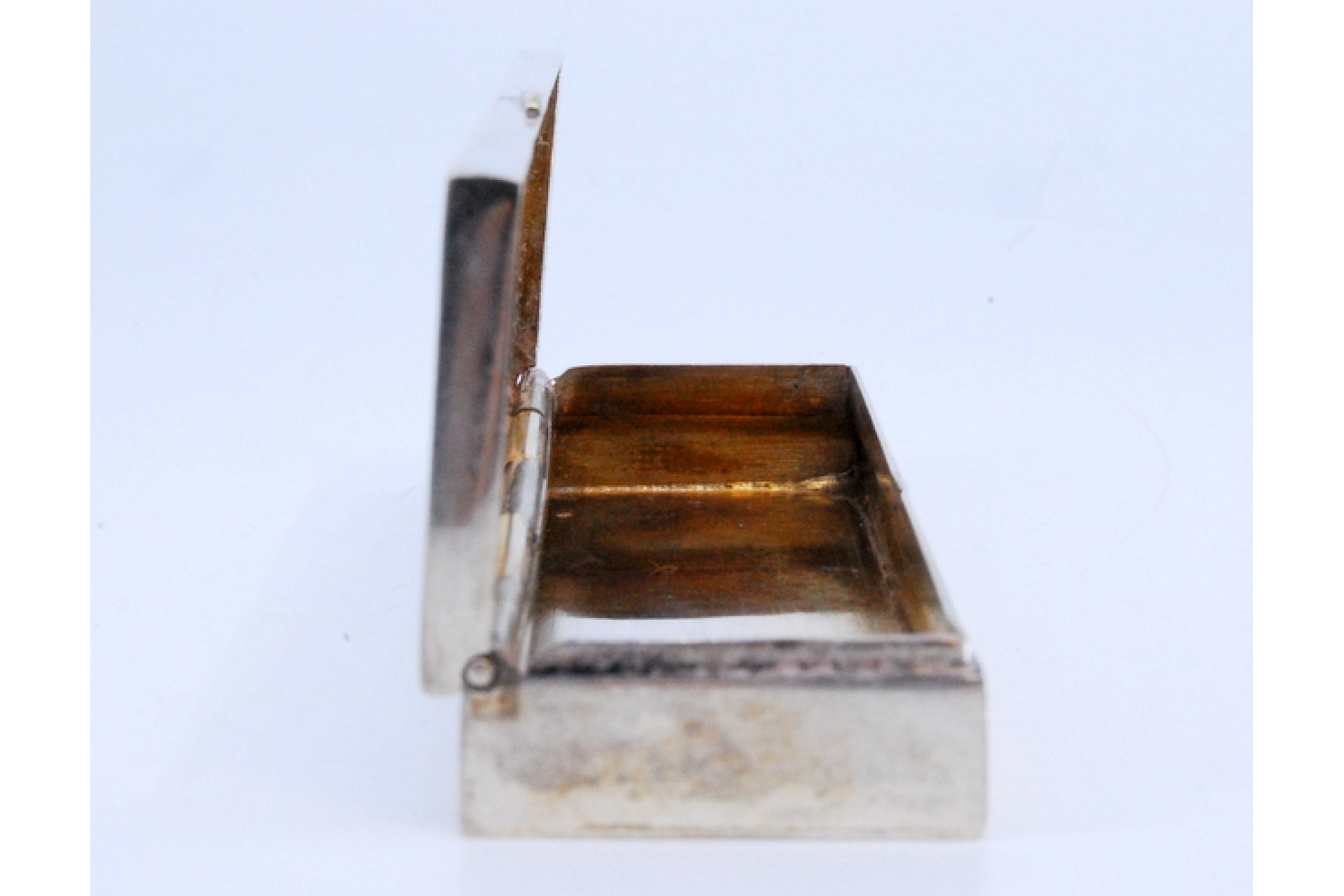 • Descrição: Caixa de rapé em prata lisa de forma retangular, tampa basculante e interior dourado.