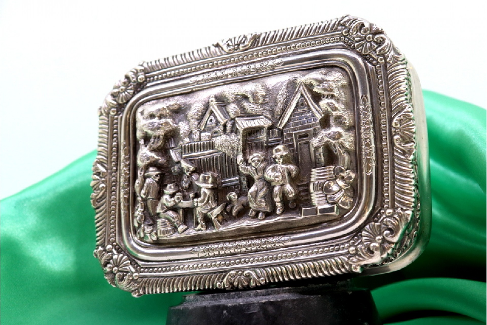 • Descrição: Caixa em prata com figuras em alto relevo em momento de diversão em aldeia envolvida por friso, motivos florais gravados, grinaldas, tampa basculante e interior dourado.