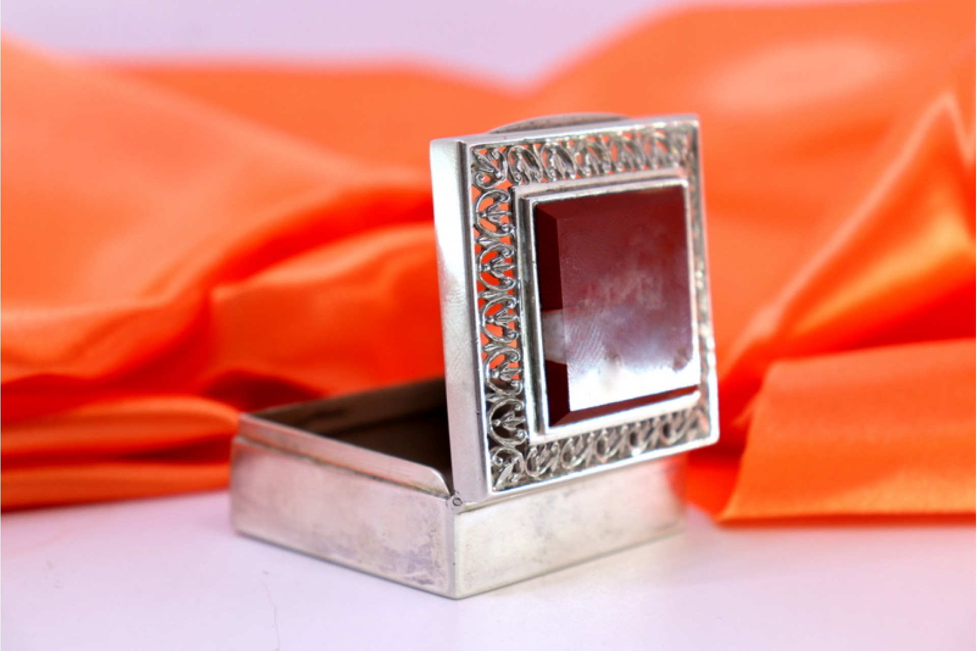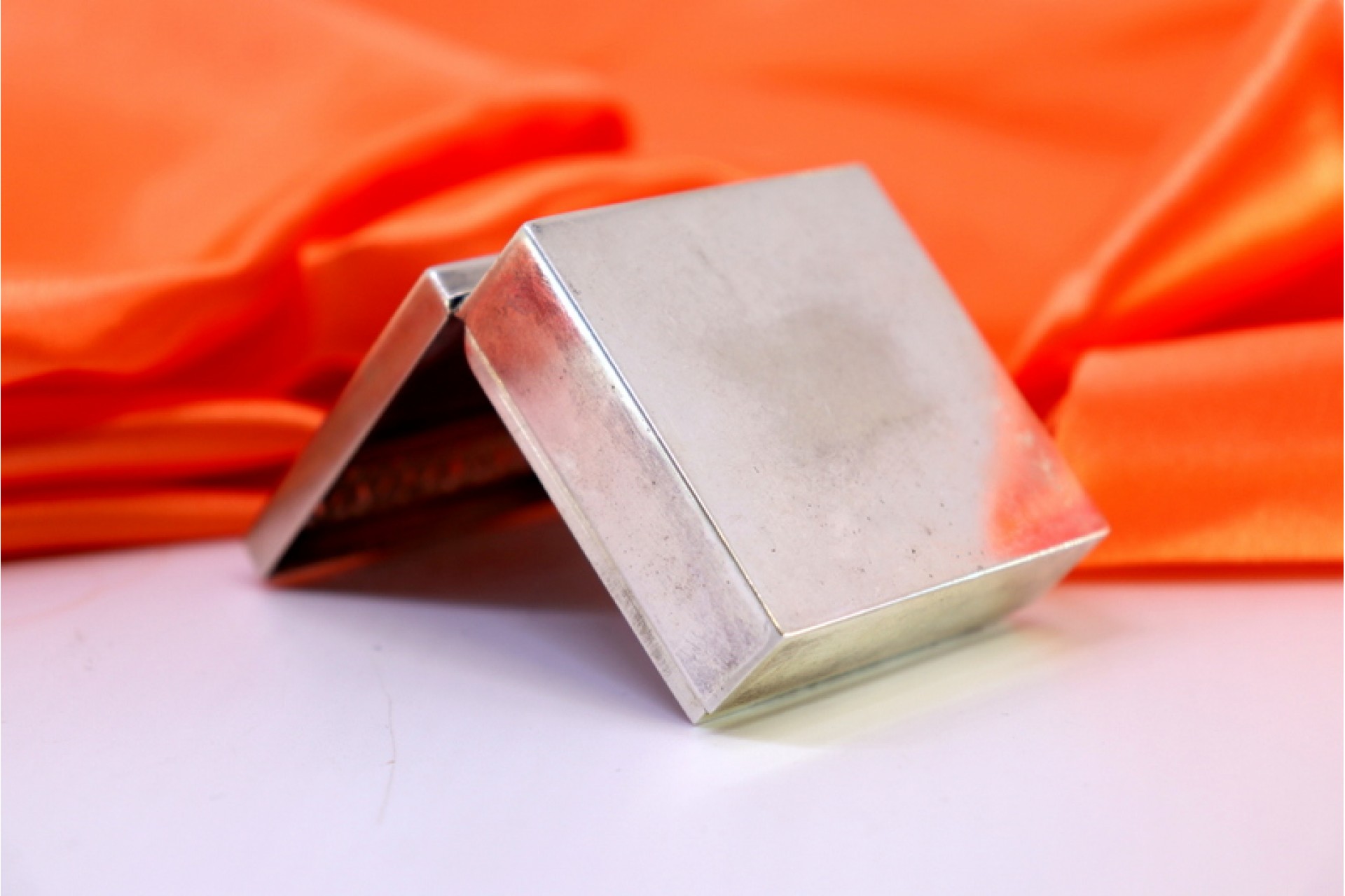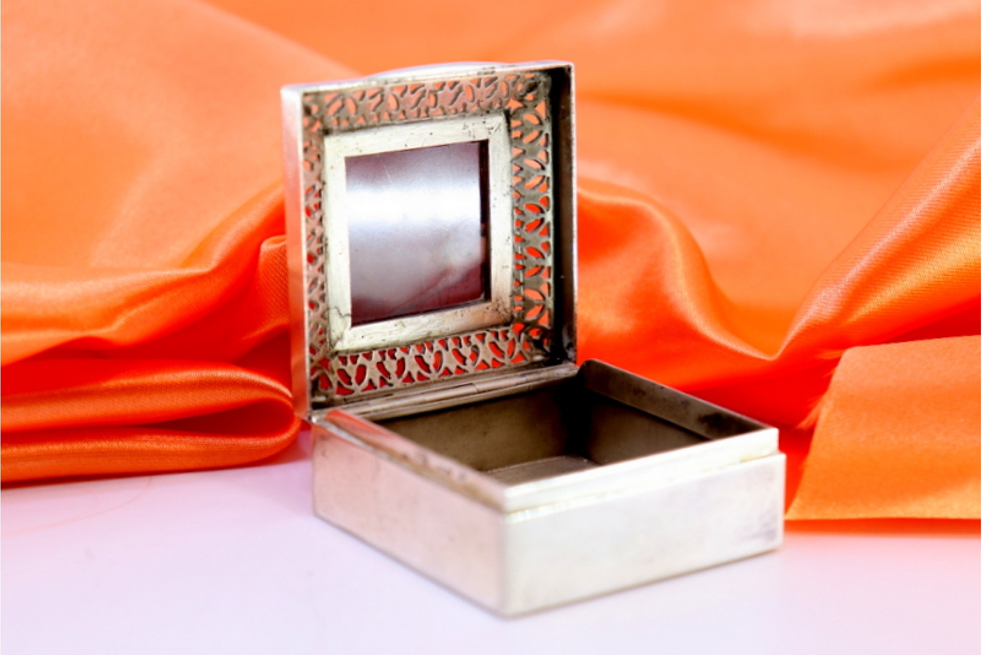 • Descrição: Caixa em prata com relevos e recortes com tampa basculante