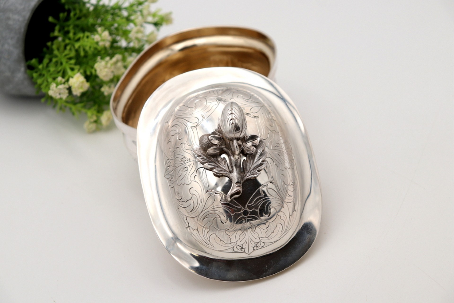 • Descrição: Caixa em prata com gravados,  pomo em forma de flor na tampa amovível e base elíptica.