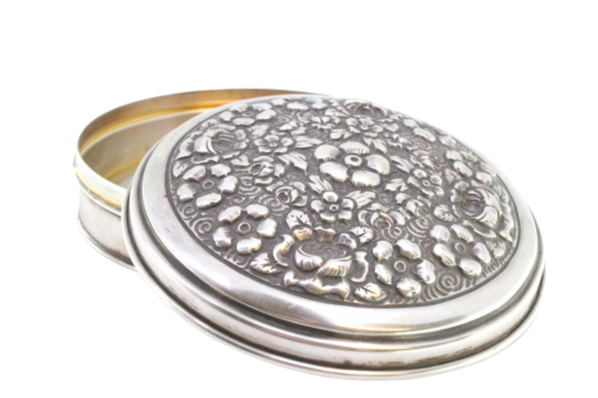 Caixa em prata com motivos florais relevados na tampa amovível e interior dourado.