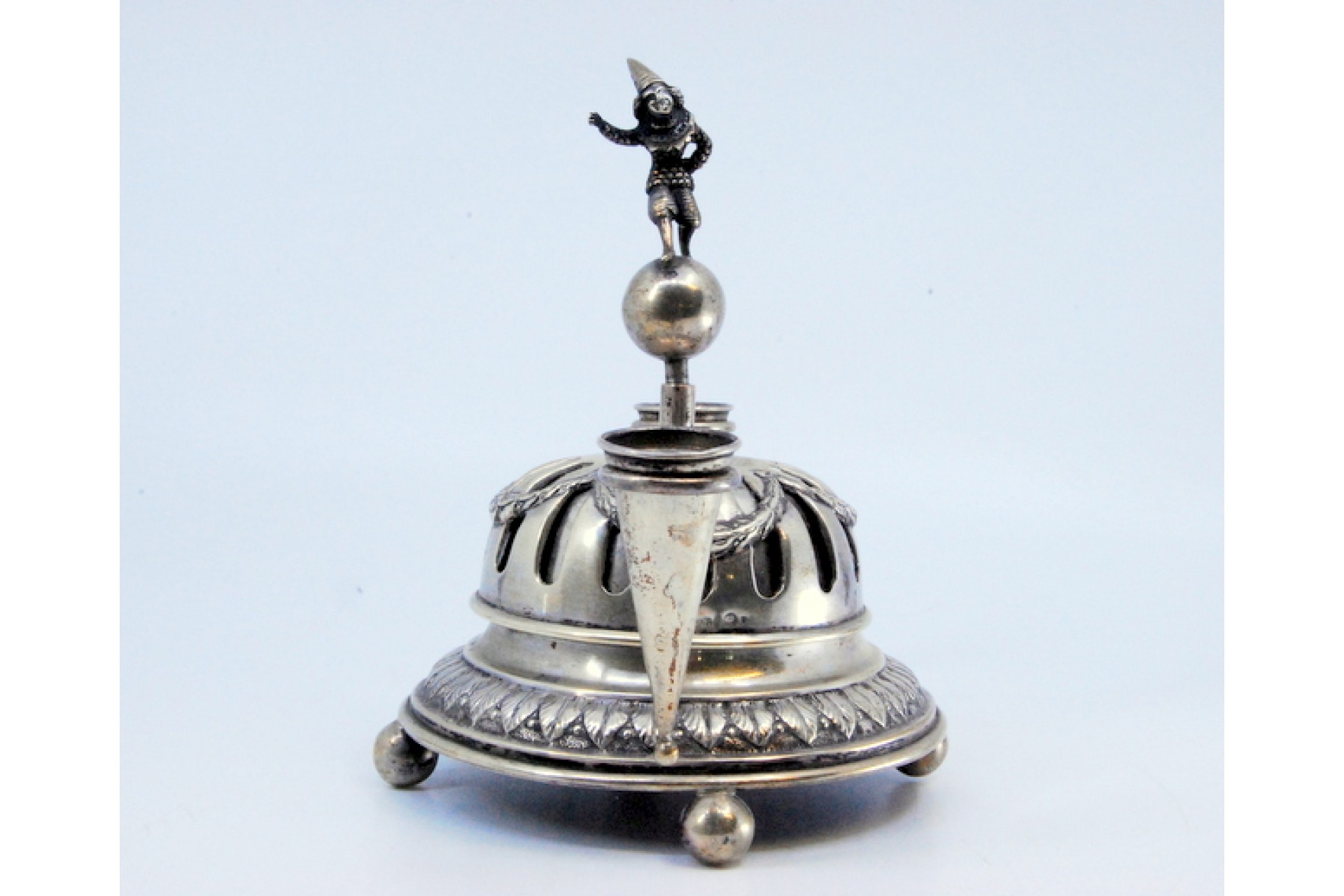 Campainha em prata com laços, grinaldas, suporte para canetas, mecanismo no interior e arlequim em pé sobre bola.