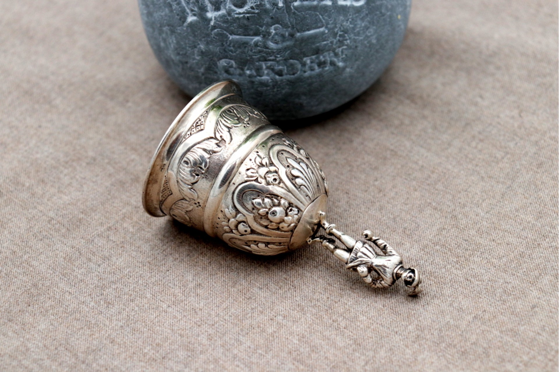 • Descrição: Campainha em prata com motivos florais relevados e guarda Alpino em vulto perfeito.