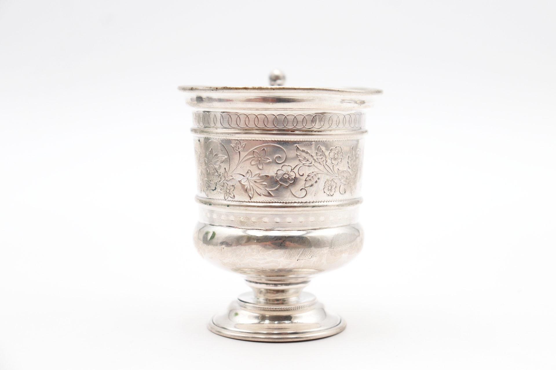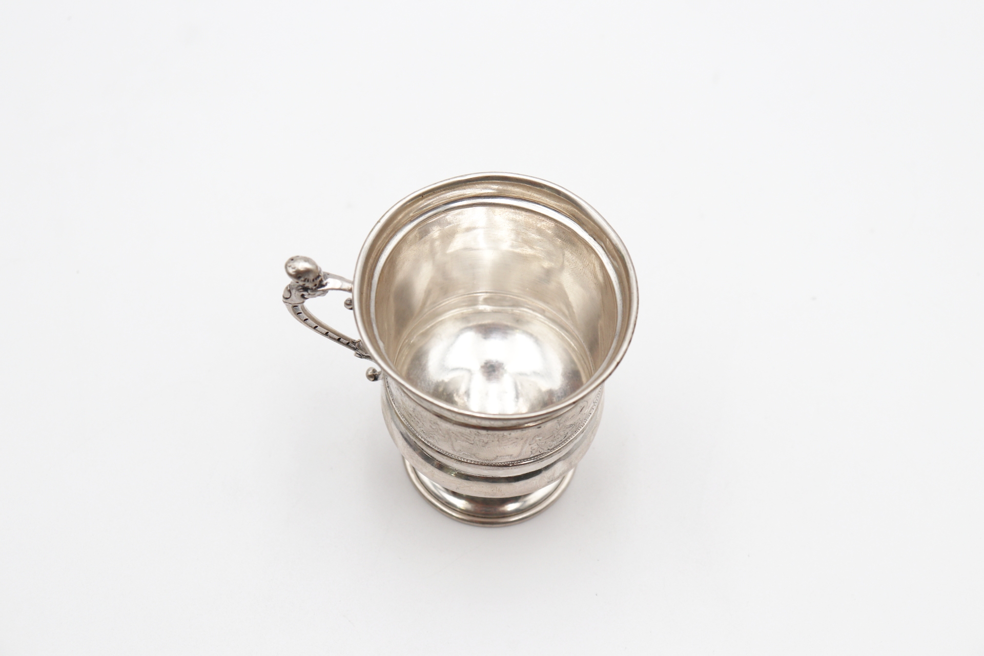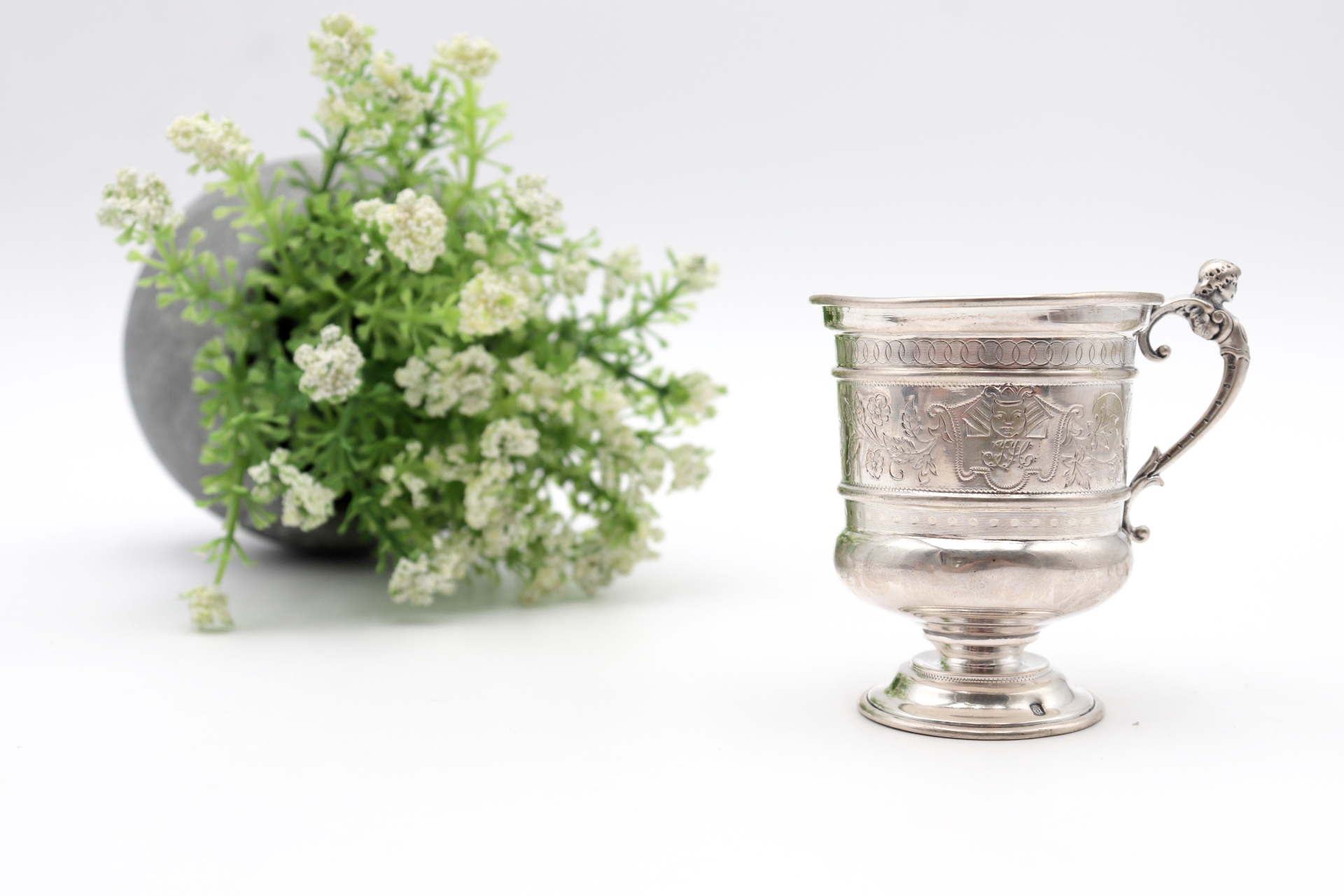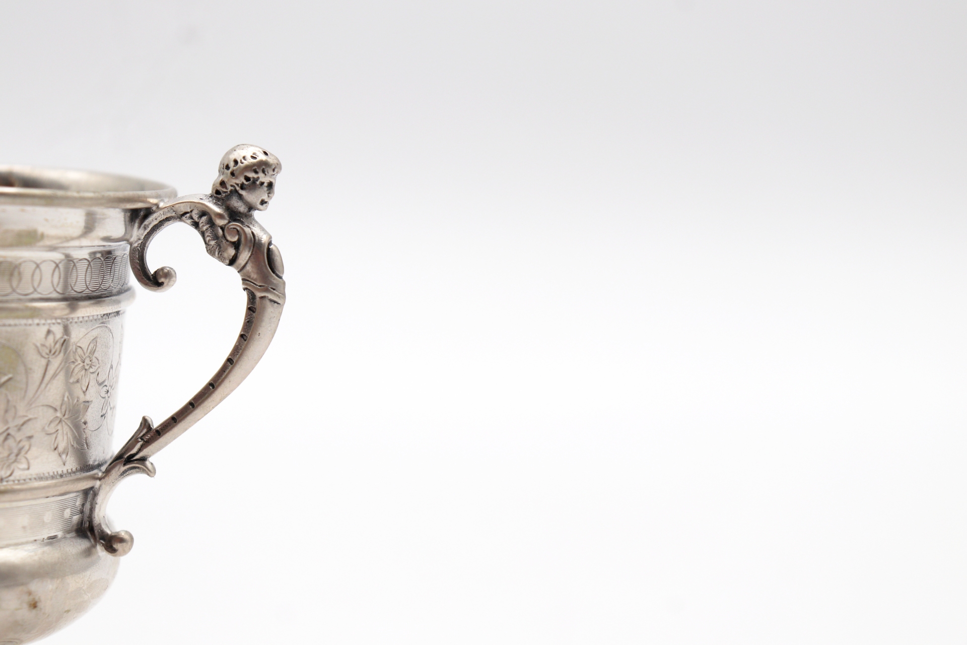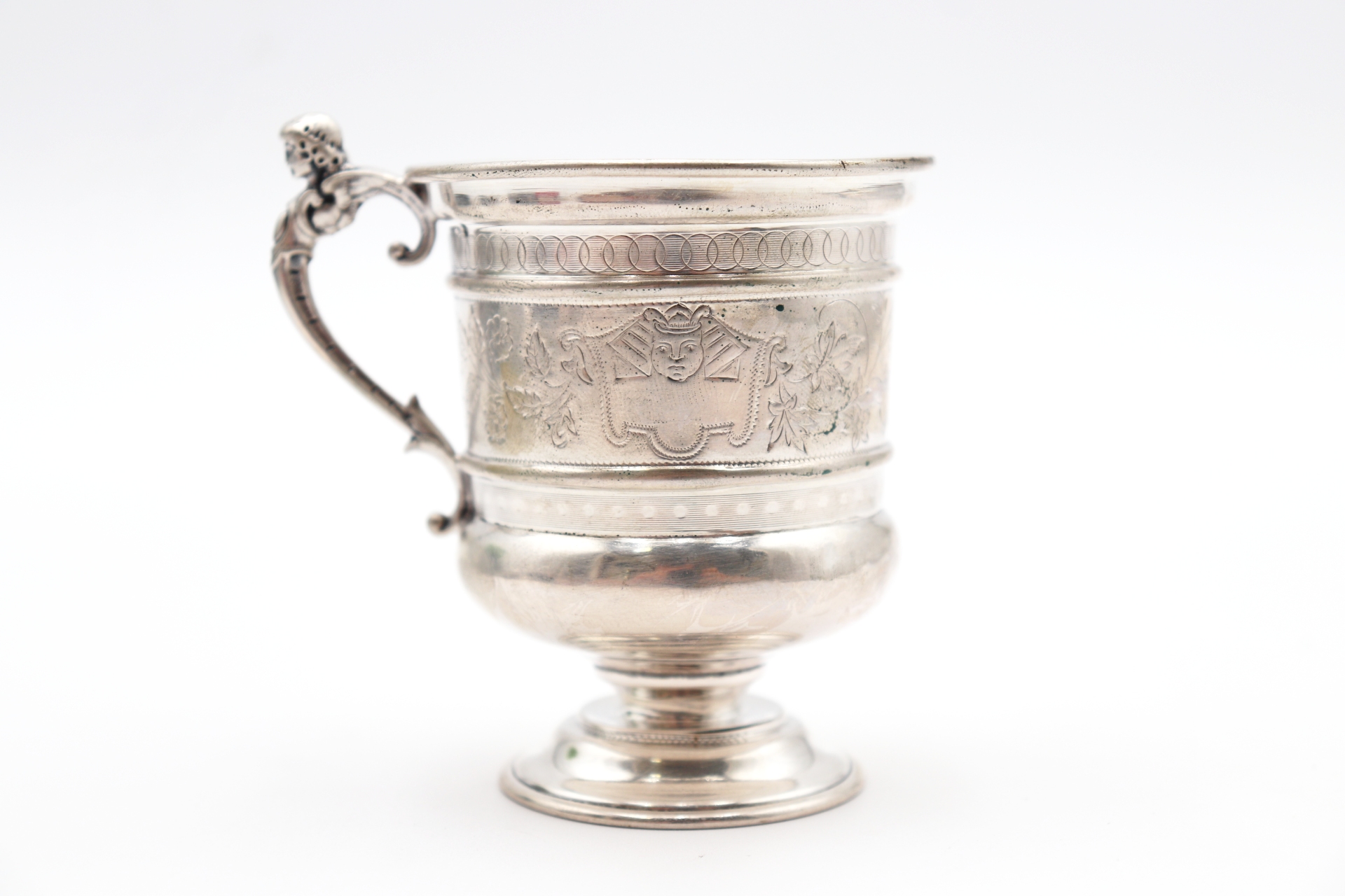 • Descrição: Caneca em prata com gravados vegetalistas e mitológicos na envolvência.