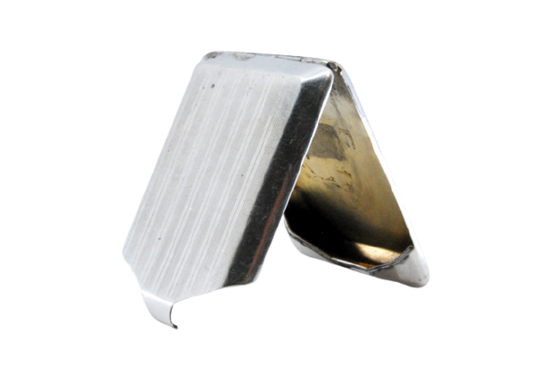 Carteira para fósforos em prata guilhochada com bandas ao alto e interior dourado.