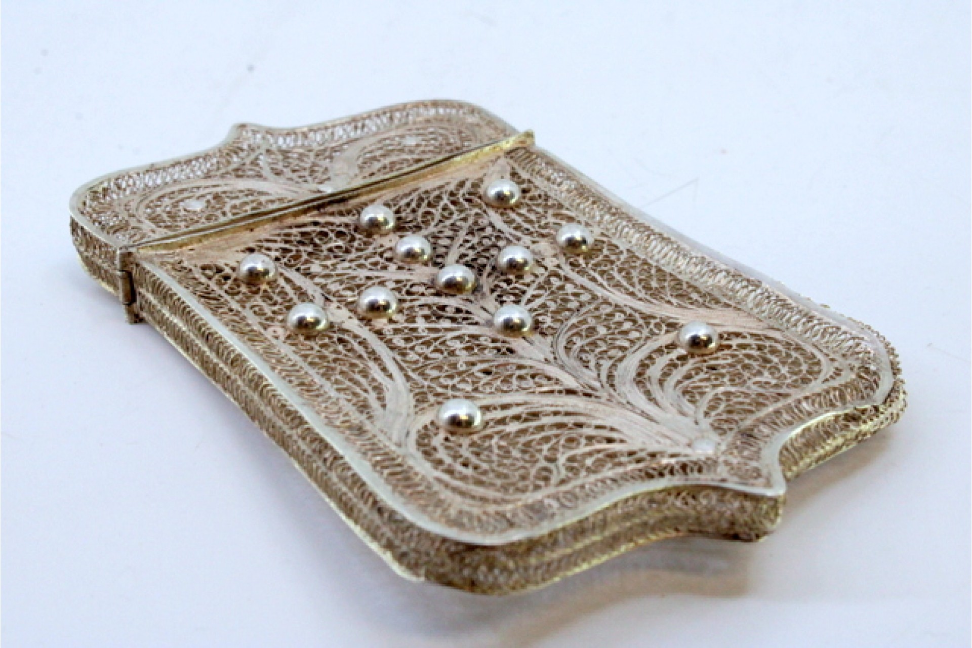 • Descrição: Cartoneira em prata de filigrana com relevos perlados com tampa basculante.