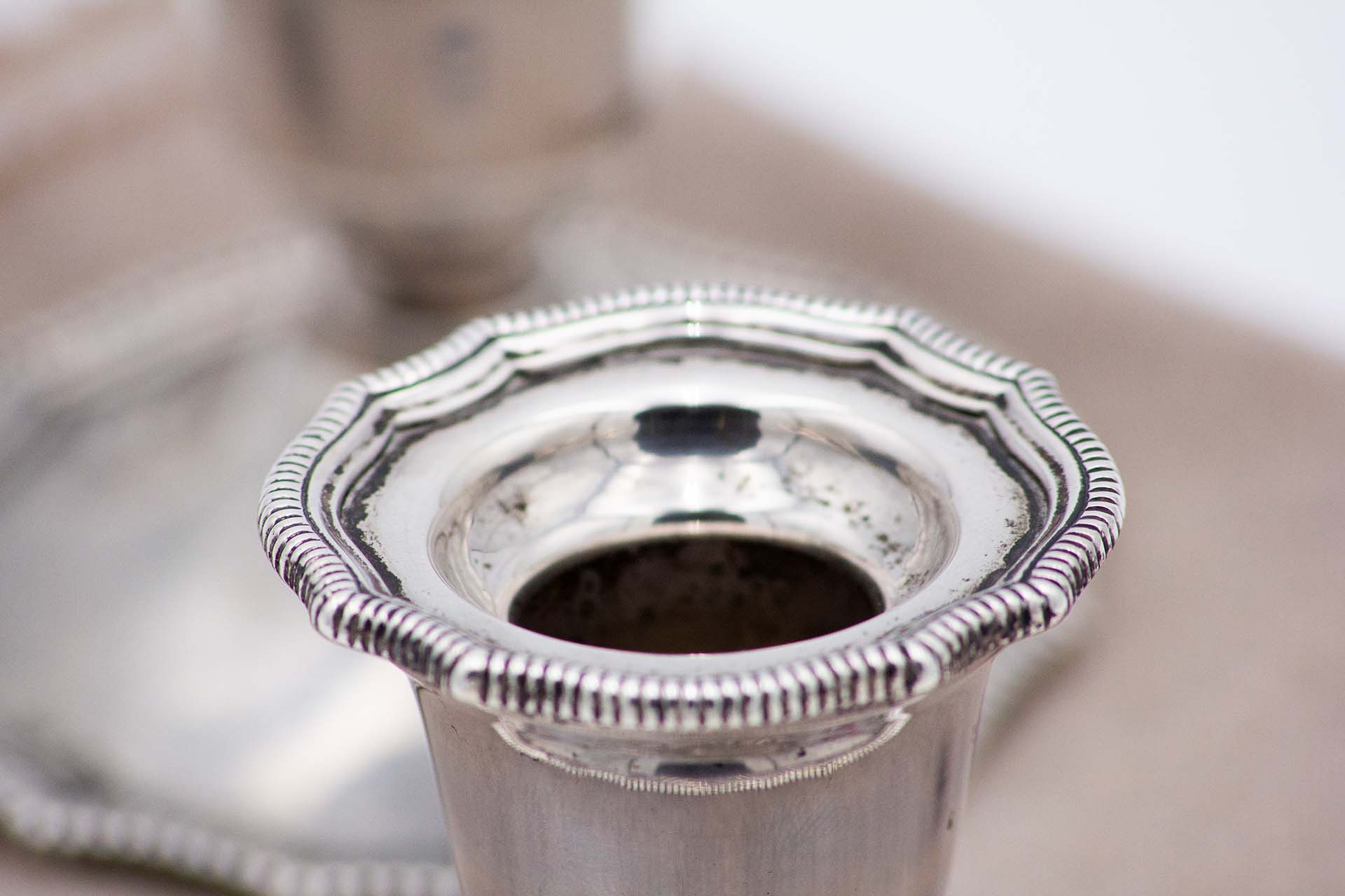 Par de castiçais baixos em prata com relevos perlados nos bordos e bases.