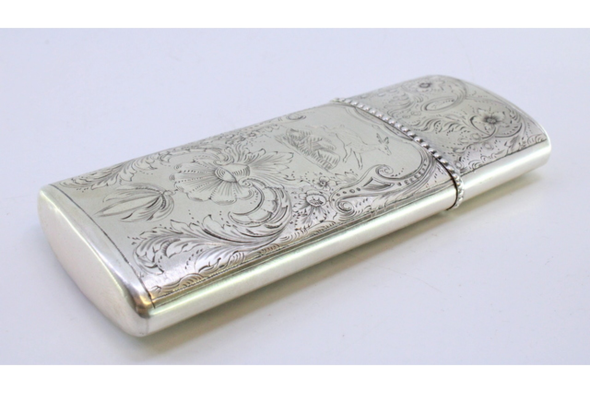 Charuteira em prata com gravados de grinaldas, flores em fundo de ambiente de caça e friso perlado na envolvência da tampa.