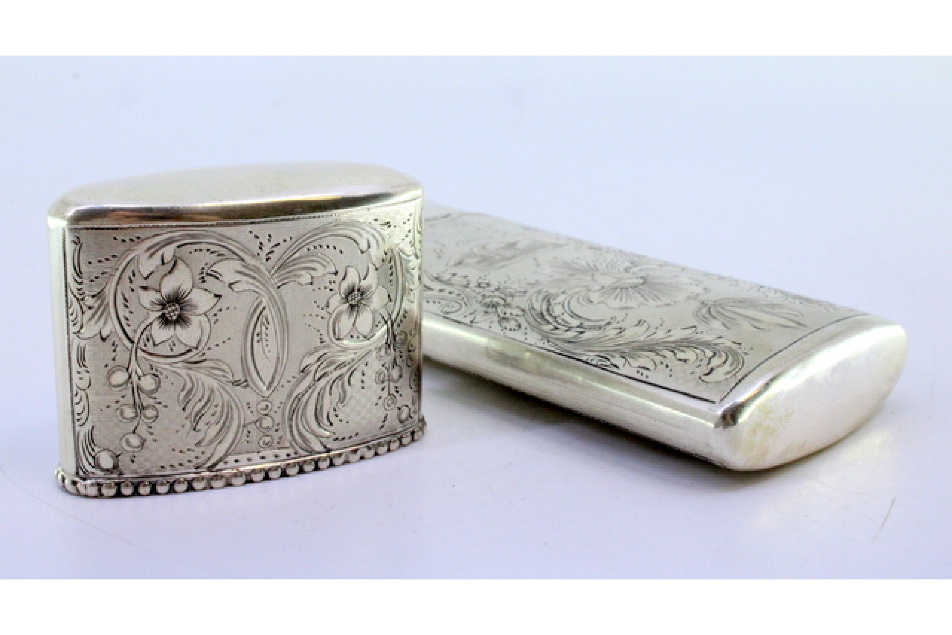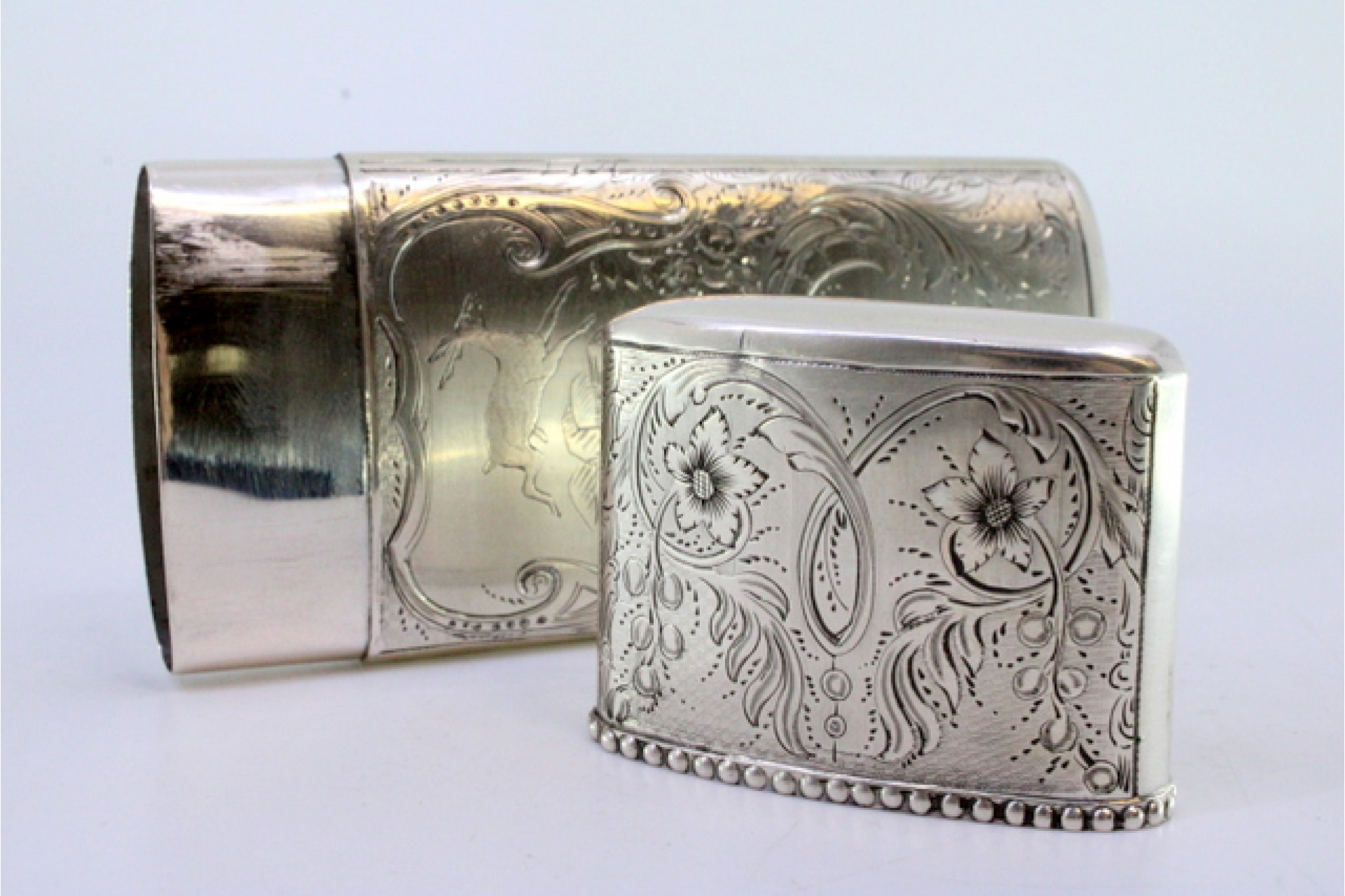 • Descrição: Charuteira em prata com gravados de grinaldas, flores em fundo de ambiente de caça e friso perlado na envolvência da tampa.