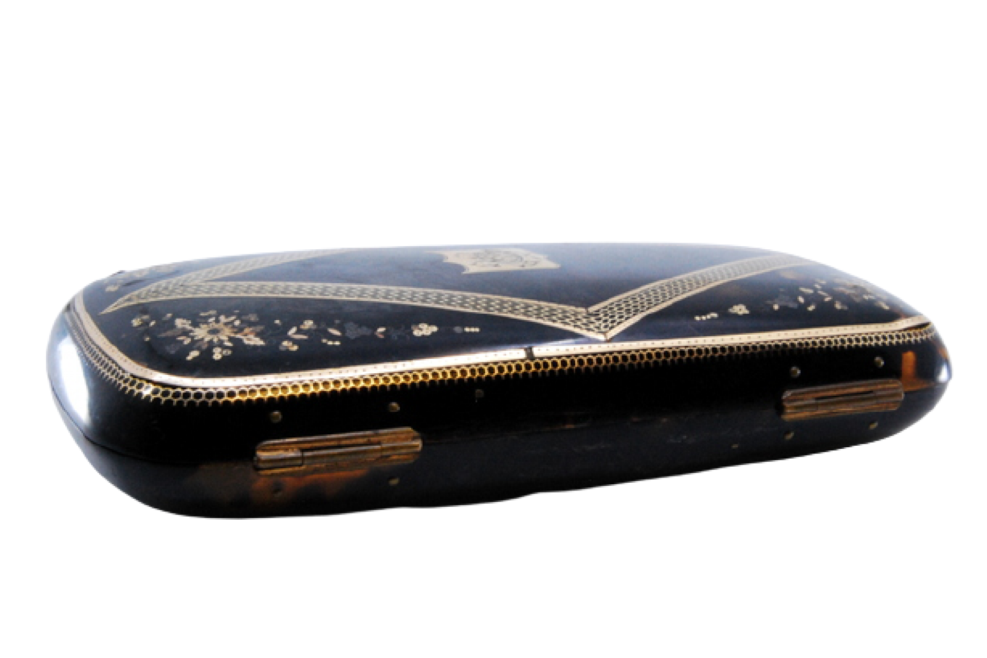 Caixa para óculos em tartaruga e aplicações em ouro, monogramada no centro.